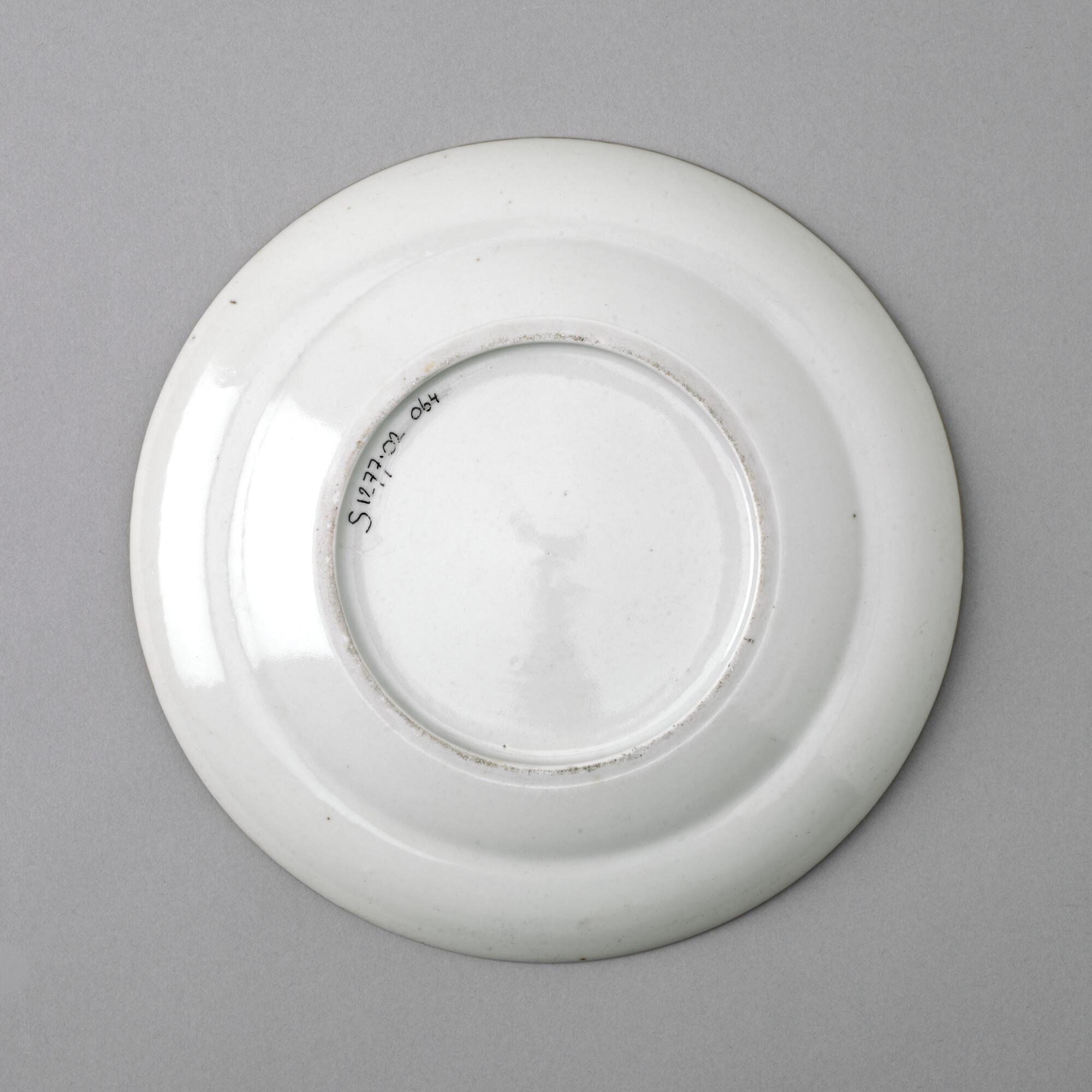 Plat bord van Chinees porselein. Gedecoreerd met een polychroom wapenschild gedragen door een tijger en een olifant. In het wapenschild het monogram "CJW" en daaronder het opschrift "Malacca".
