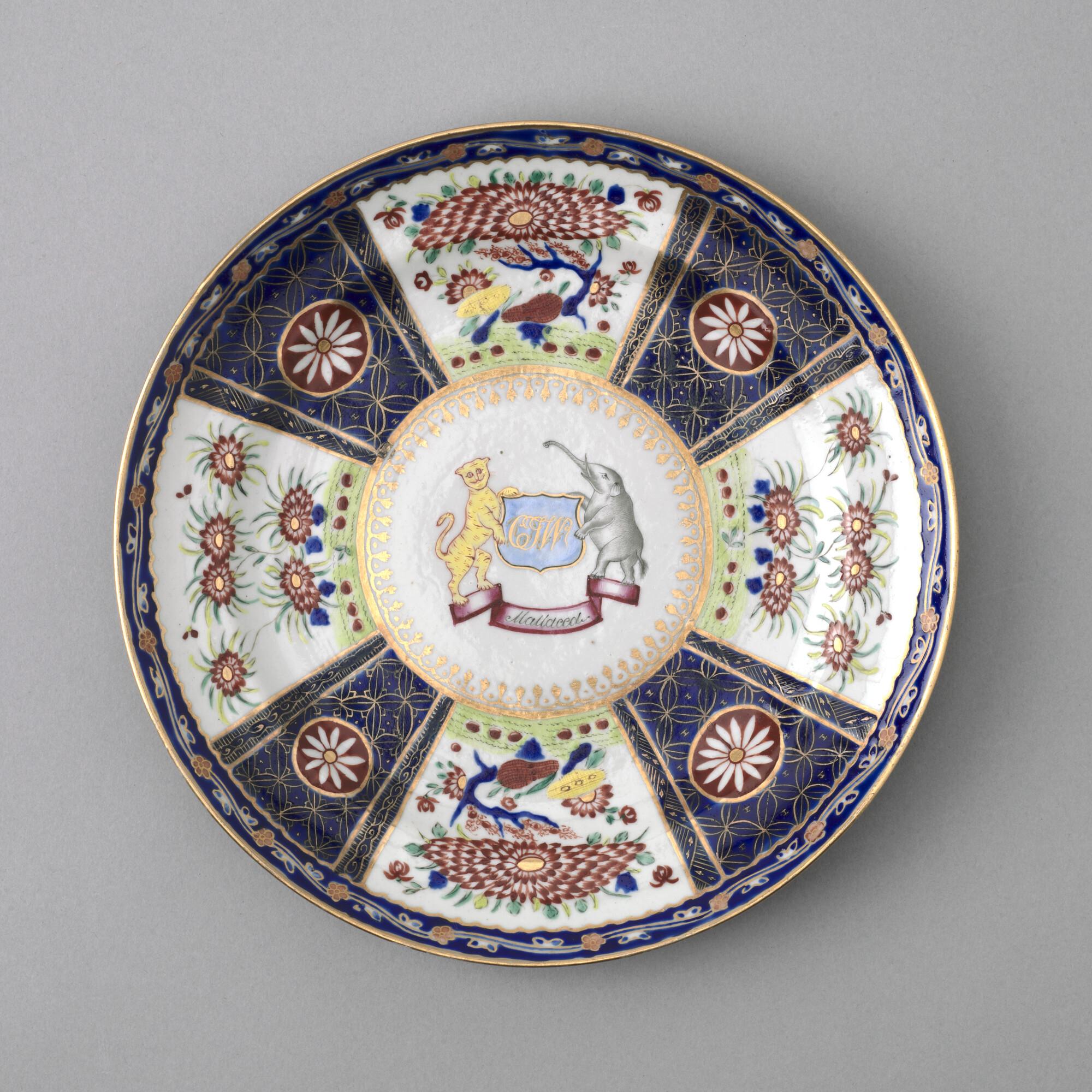 Plat bord van Chinees porselein. Gedecoreerd met een polychroom wapenschild gedragen door een tijger en een olifant. In het wapenschild het monogram "CJW" en daaronder het opschrift "Malacca".