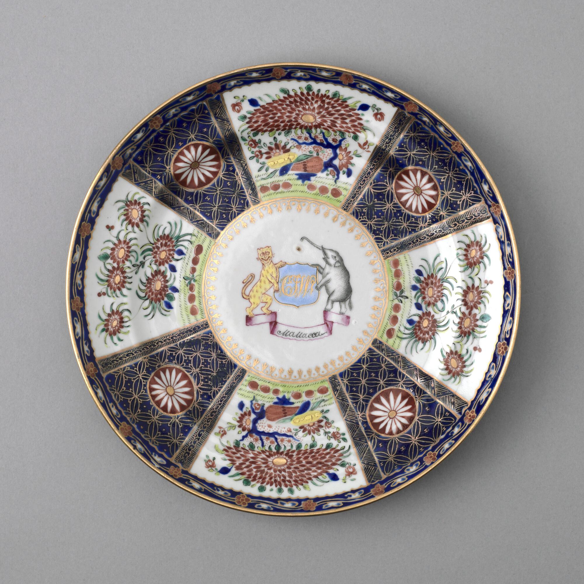 Plat bord van Chinees porselein. Gedecoreerd met een polychroom wapenschild gedragen door een tijger en een olifant. In het wapenschild het monogram "CJW" en daaronder het opschrift "Malacca".