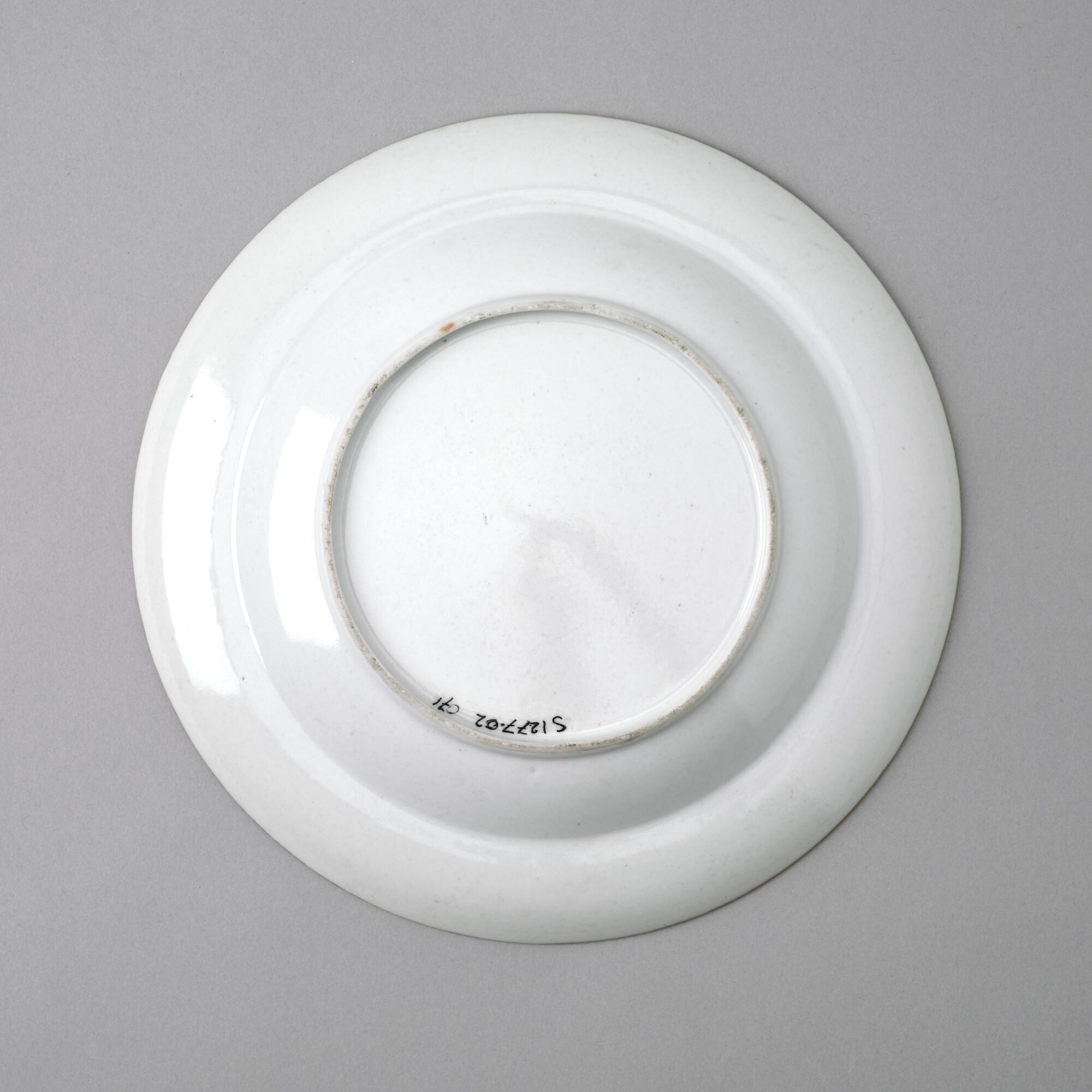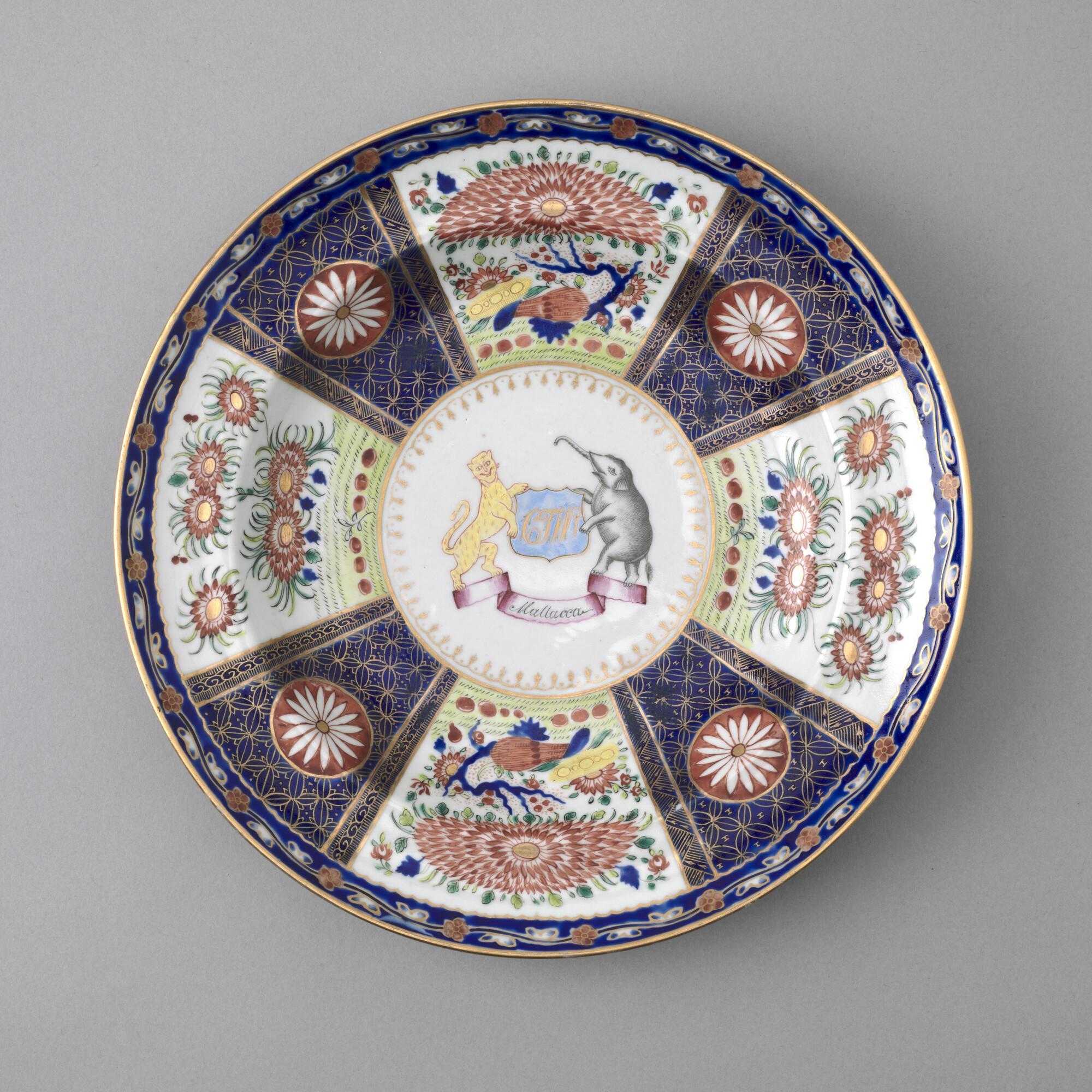 Diep bord van Chinees porselein. Gedecoreerd met een polychroom wapenschild gedragen door een tijger en een olifant. In het wapenschild het monogram "CJW" en daaronder het opschrift "Malacca".