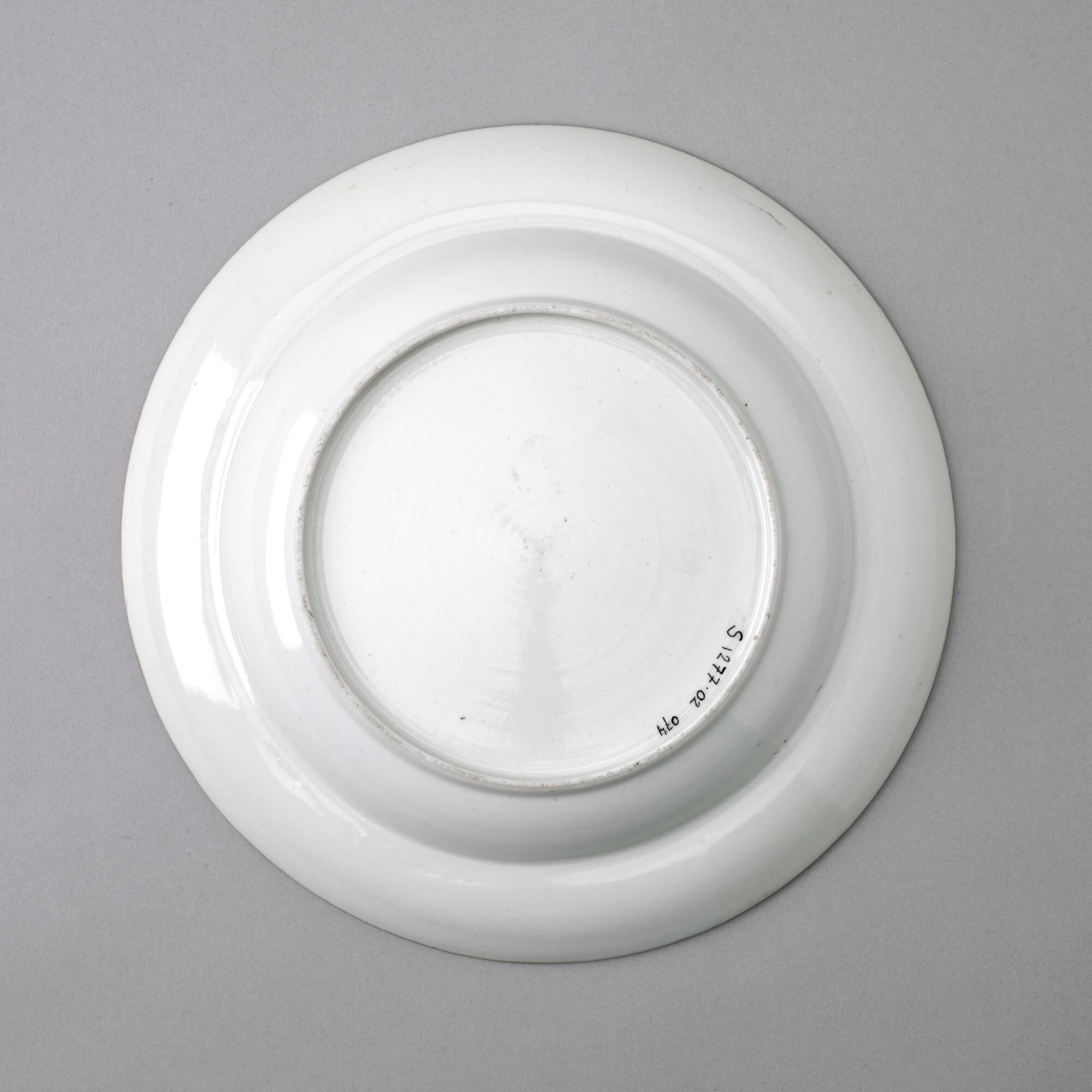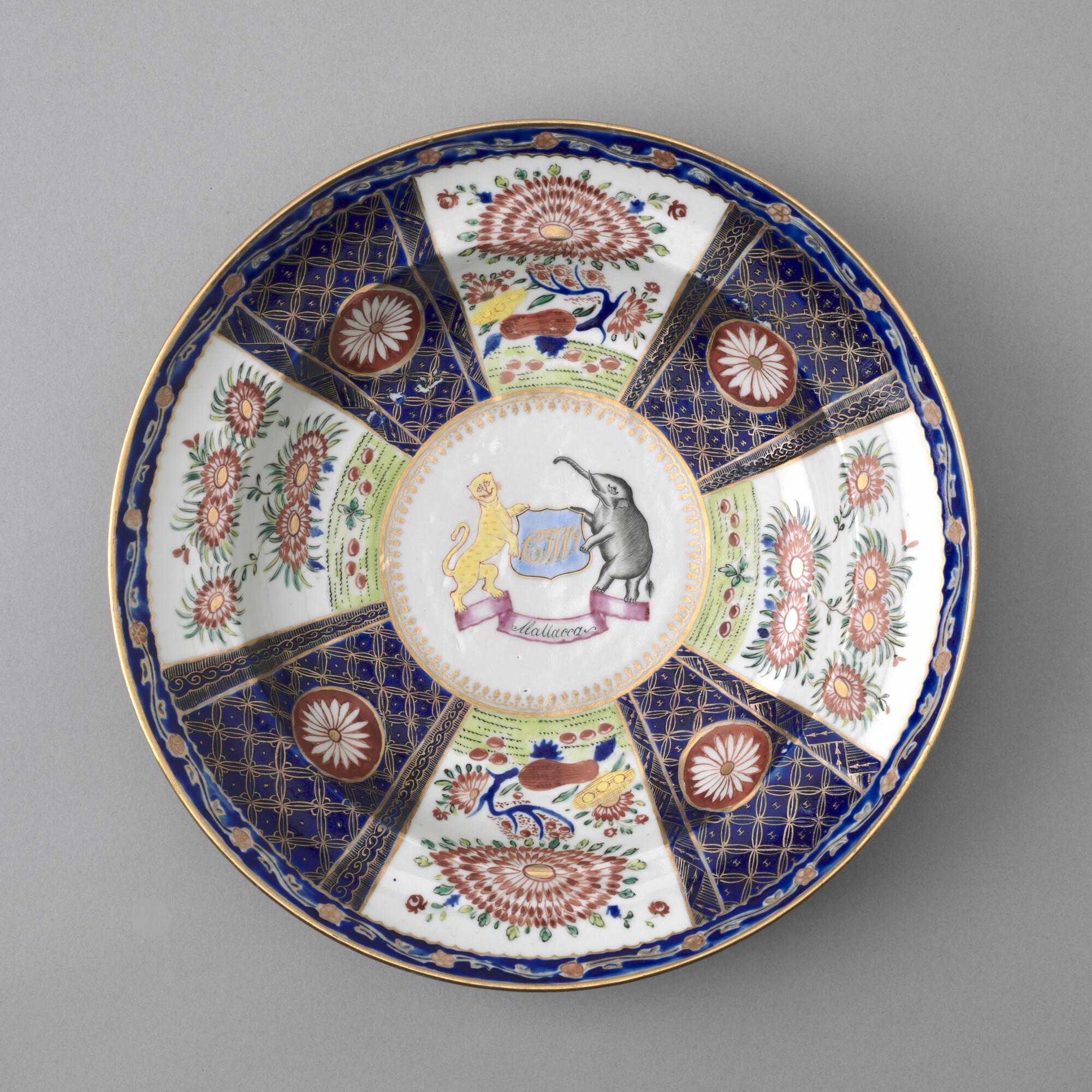 Diep bord van Chinees porselein. Gedecoreerd met een polychroom wapenschild gedragen door een tijger en een olifant. In het wapenschild het monogram "CJW" en daaronder het opschrift "Malacca".