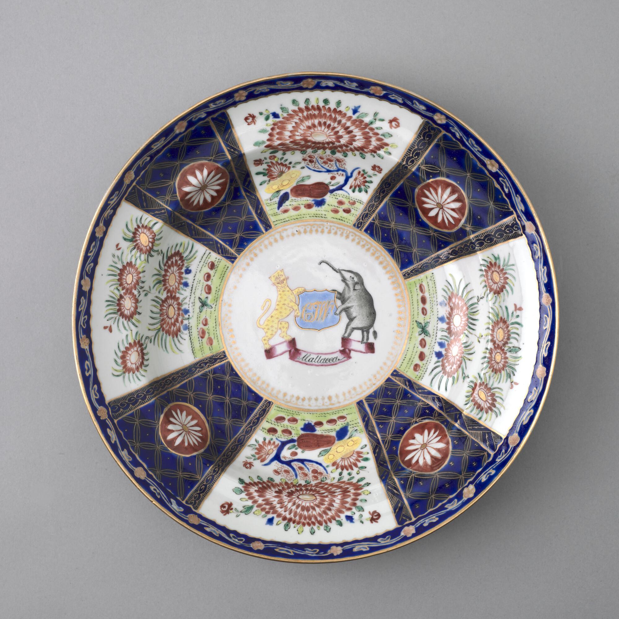 Diep bord van Chinees porselein. Gedecoreerd met een polychroom wapenschild gedragen door een tijger en een olifant. In het wapenschild het monogram "CJW" en daaronder het opschrift "Malacca".