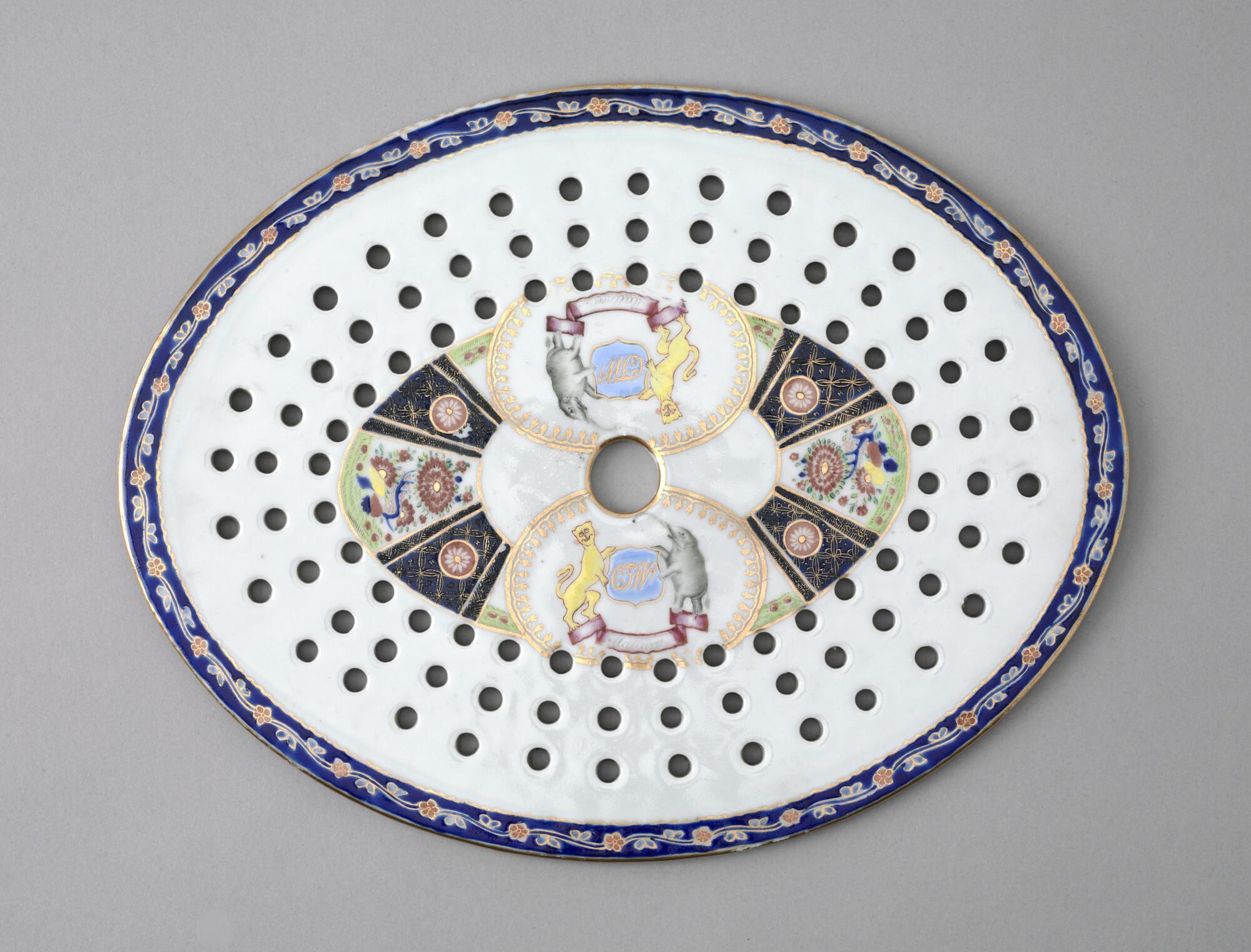 Ovale lekplaat (voor vis of groenten) van Chinees porselein. Gedecoreerd met een polychroom wapenschild gedragen door een tijger en een olifant. In het wapenschild het monogram "CJW" en daaronder het opschrift "Malacca".