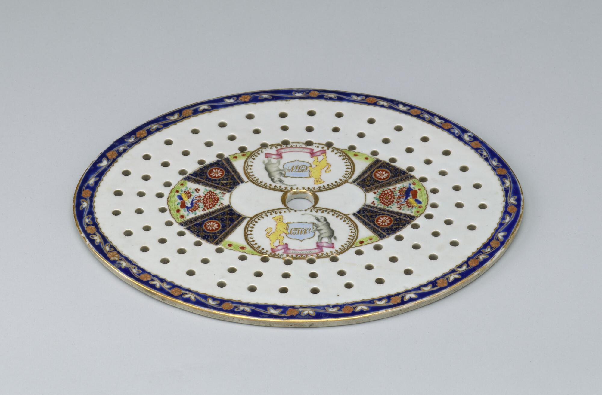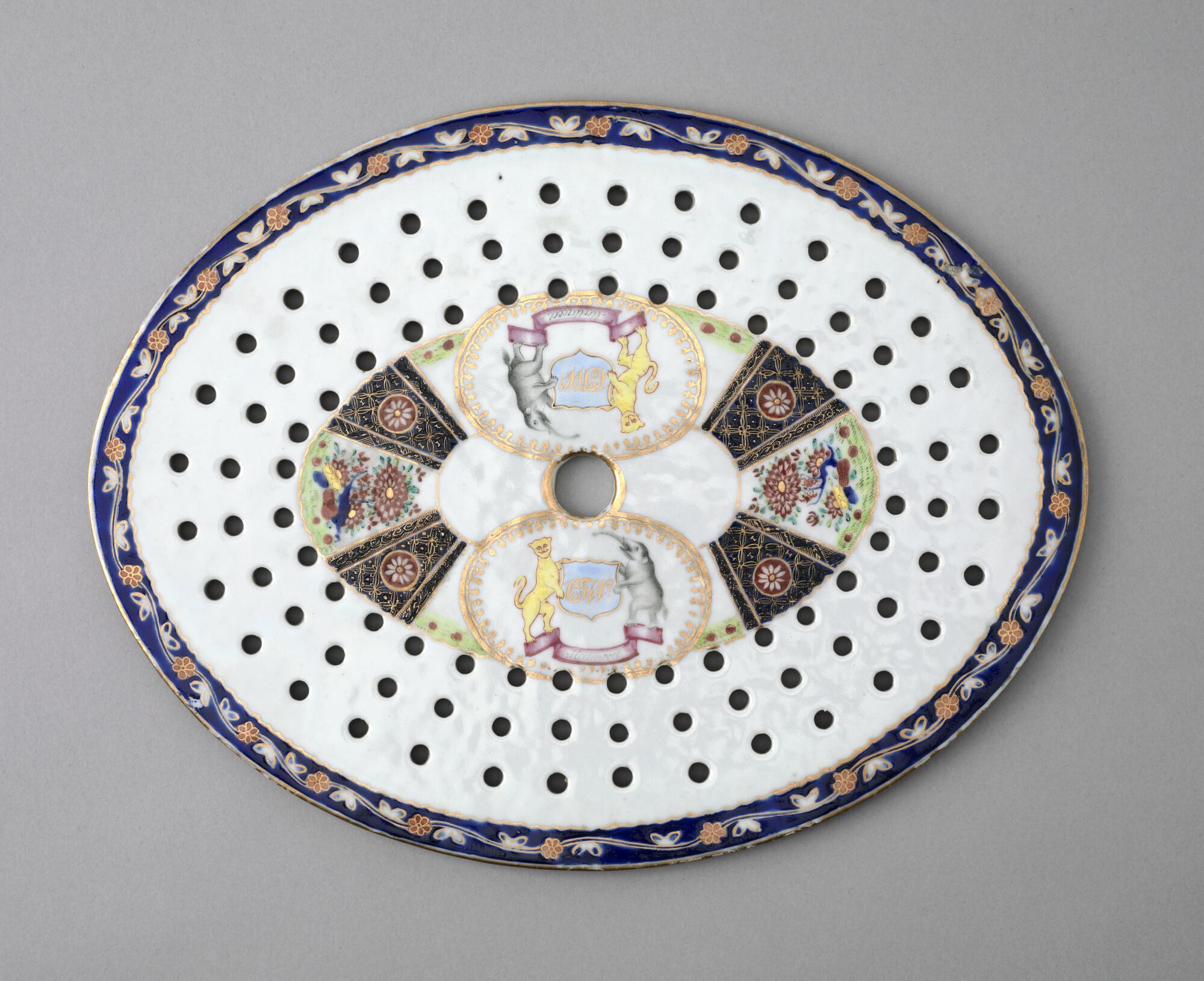 Ovale lekplaat (voor vis of groenten) van Chinees porselein. Gedecoreerd met een polychroom wapenschild gedragen door een tijger en een olifant. In het wapenschild het monogram "CJW" en daaronder het opschrift "Malacca".