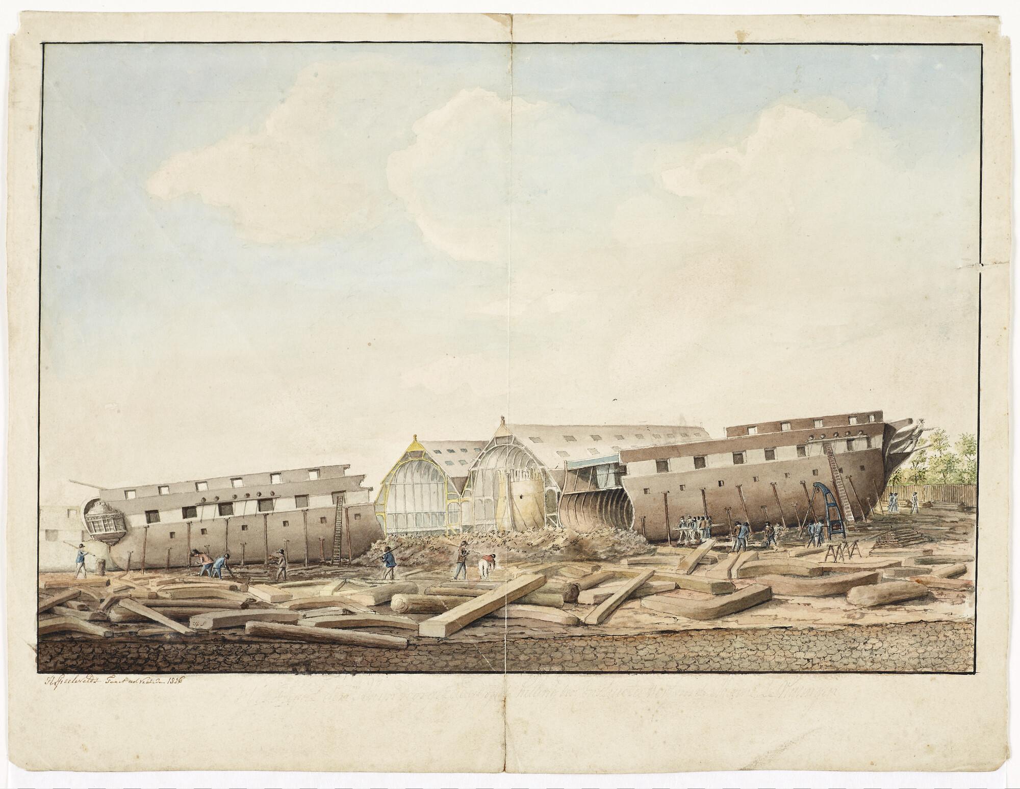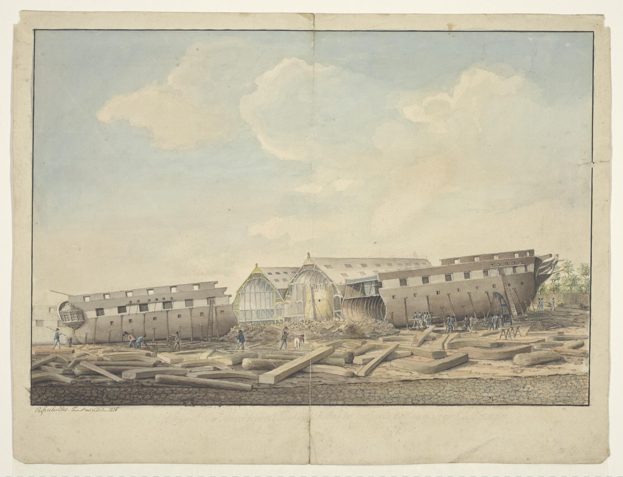 Het fregat Zr.Ms. 'Rijn' doorgezaagd op de helling van de constructiewerf te Vlissingen