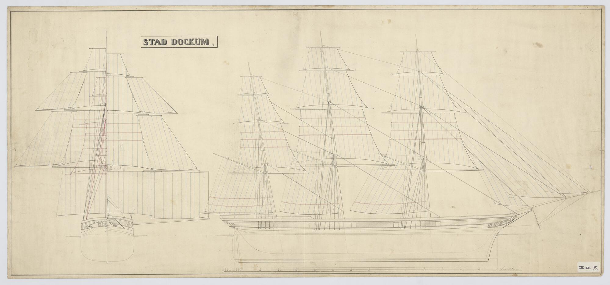 Klipperfregat Stad Dockum 1856: tuigplan, lijnenplan, zijaanzicht, vooraanzicht, achteraanzicht, waterlijnen, spantenraam.