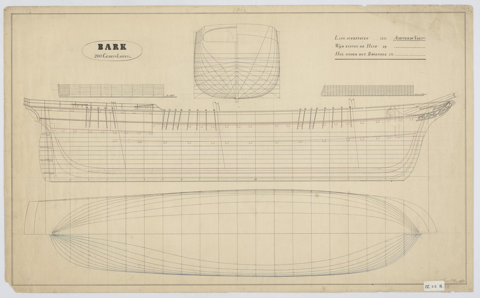 Zijaanzicht, vooraanzicht, achteraanzicht, senten, waterlijnen, spantenraam van een bark. Afmetingen 132½ x 29 x 17½ 1862.