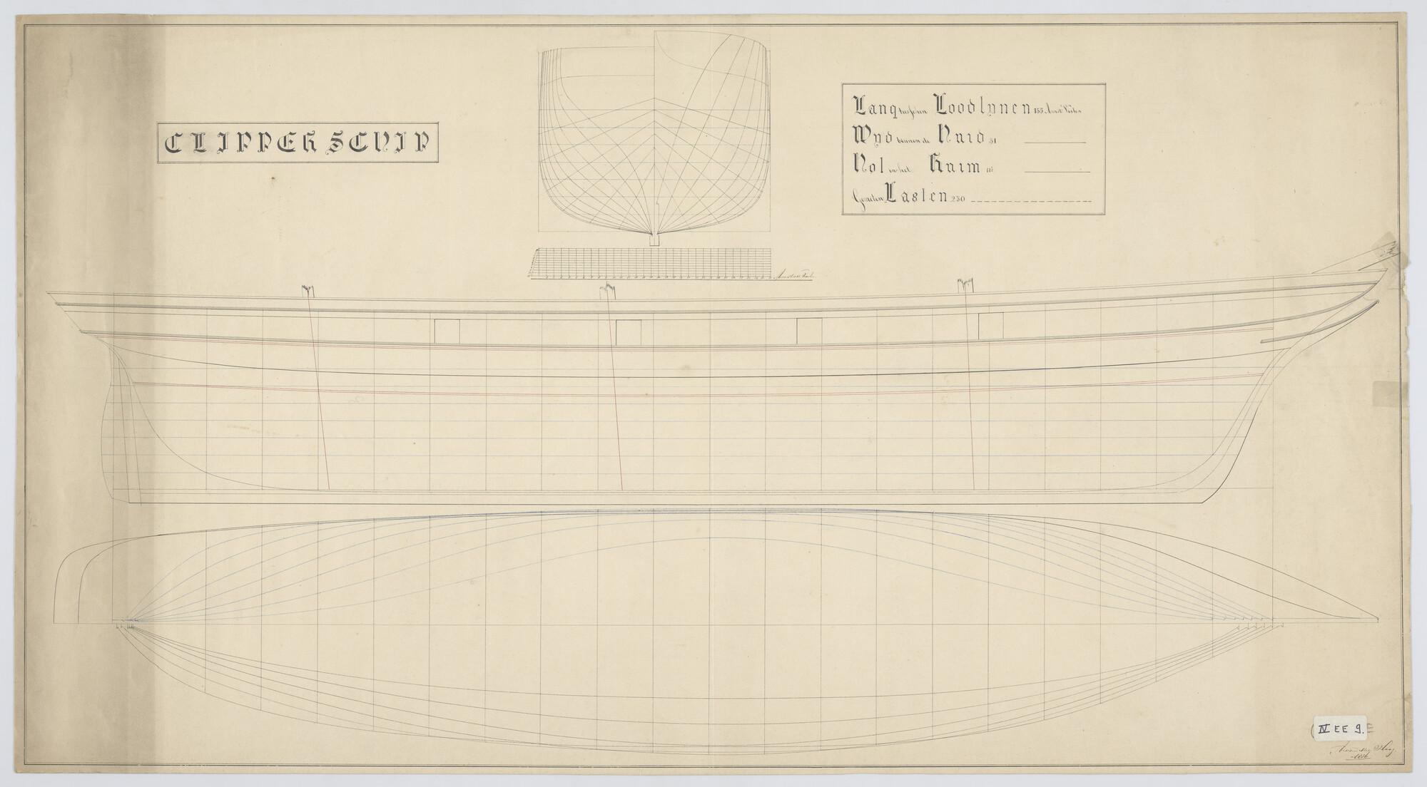 Zijaanzicht, vooraanzicht, achteraanzicht, senten, waterlijnen van een klipperschip, 1856 155 x 31 x 11½ 250 last.