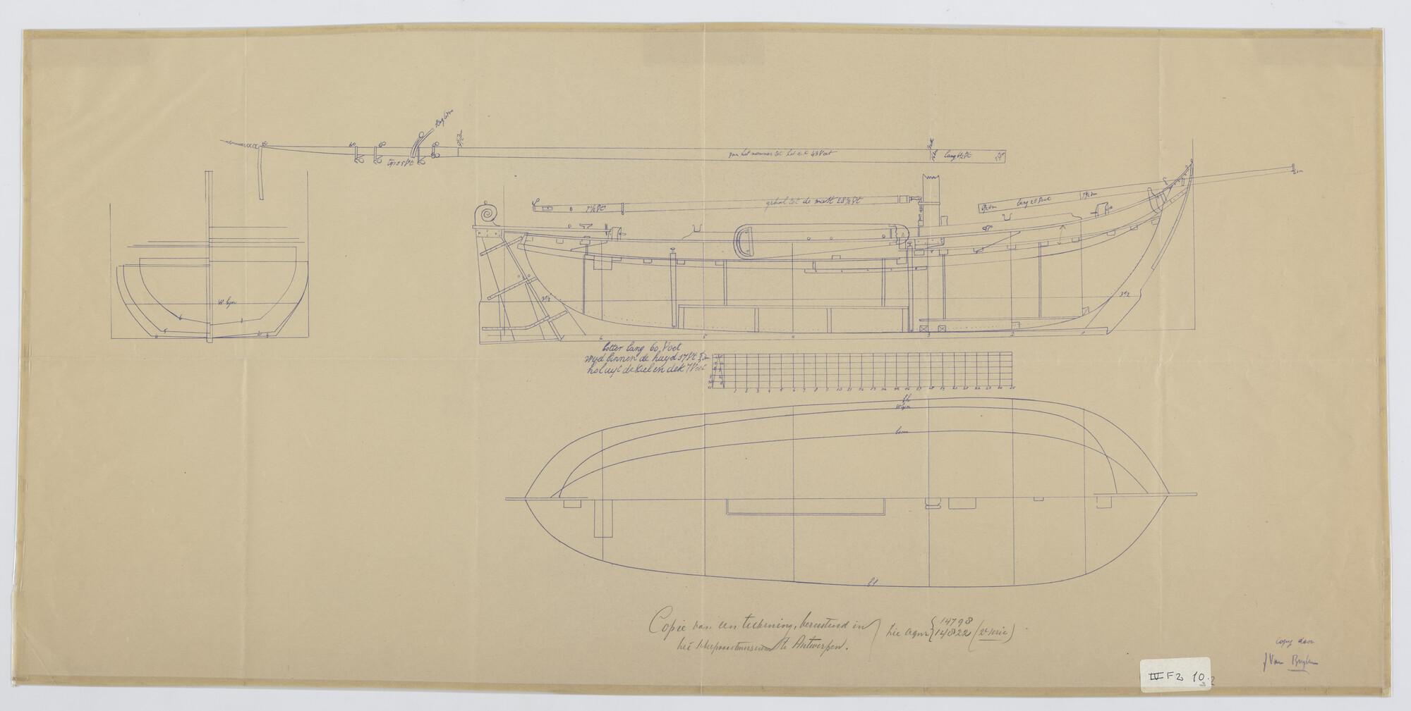 Zijaanzicht, vooraanzicht, achteraanzicht, waterlijnen, dwarsdoorsnede doftspant, dwarsdoorsnede Hoofdspant, Tuigplan