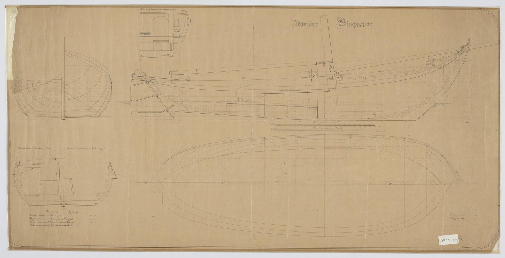 Zijaanzicht, vooraanzicht, achteraanzicht, waterlijnen, dwarsdoorsnede doftspant, dwarsdoorsnede Hoofdspant, Tuigplan. Marker sleepbotter (1889). Afmetingen 46 x 13.5 x 6 voet.
