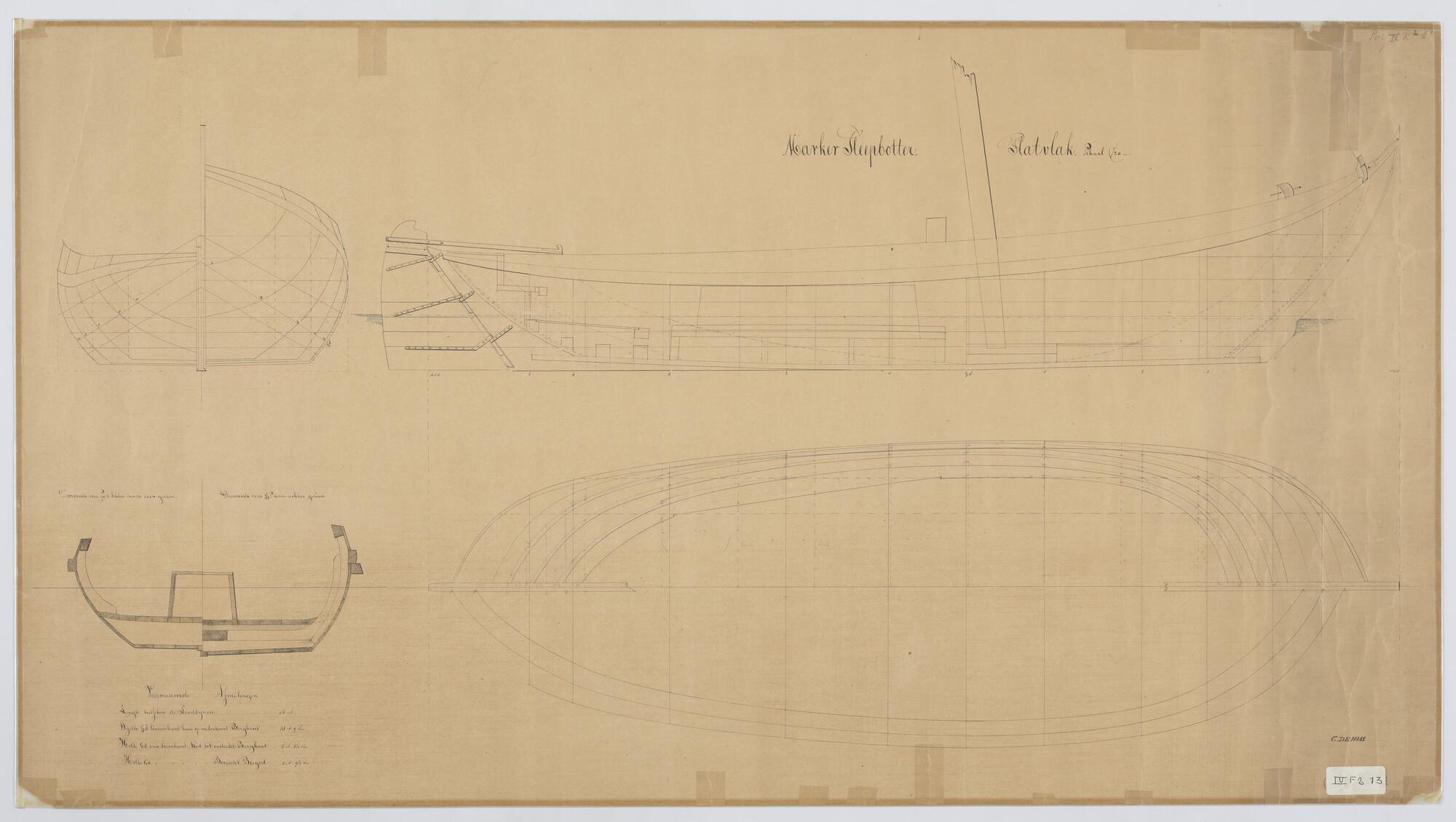 Zijaanzicht, vooraanzicht, achteraanzicht, grootspant, dwarsdoorsnede, waterlijnen van een Marker sleepbotter, 46.13.9 x 5.9½.