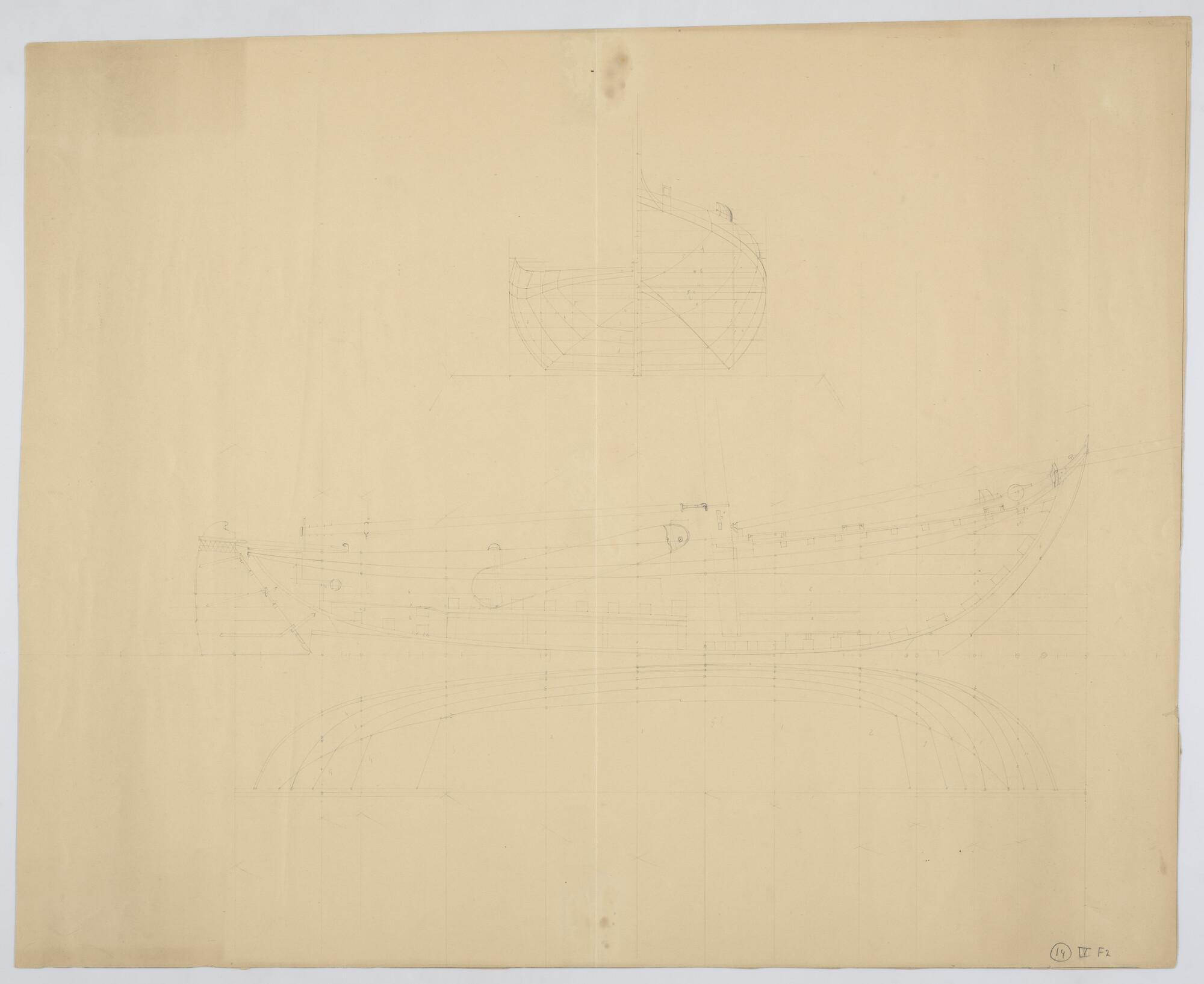 Verticale langsdoorsnede, voor- en achteraanzicht en waterlijnen van een sleepbotter