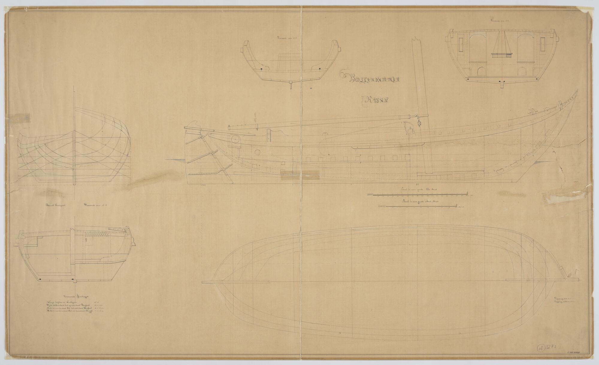 Verticale langsdoorsnede, voor- en achteraanzicht, waterlijnen en dwarsdoorsneden van een Vollendammer kwak