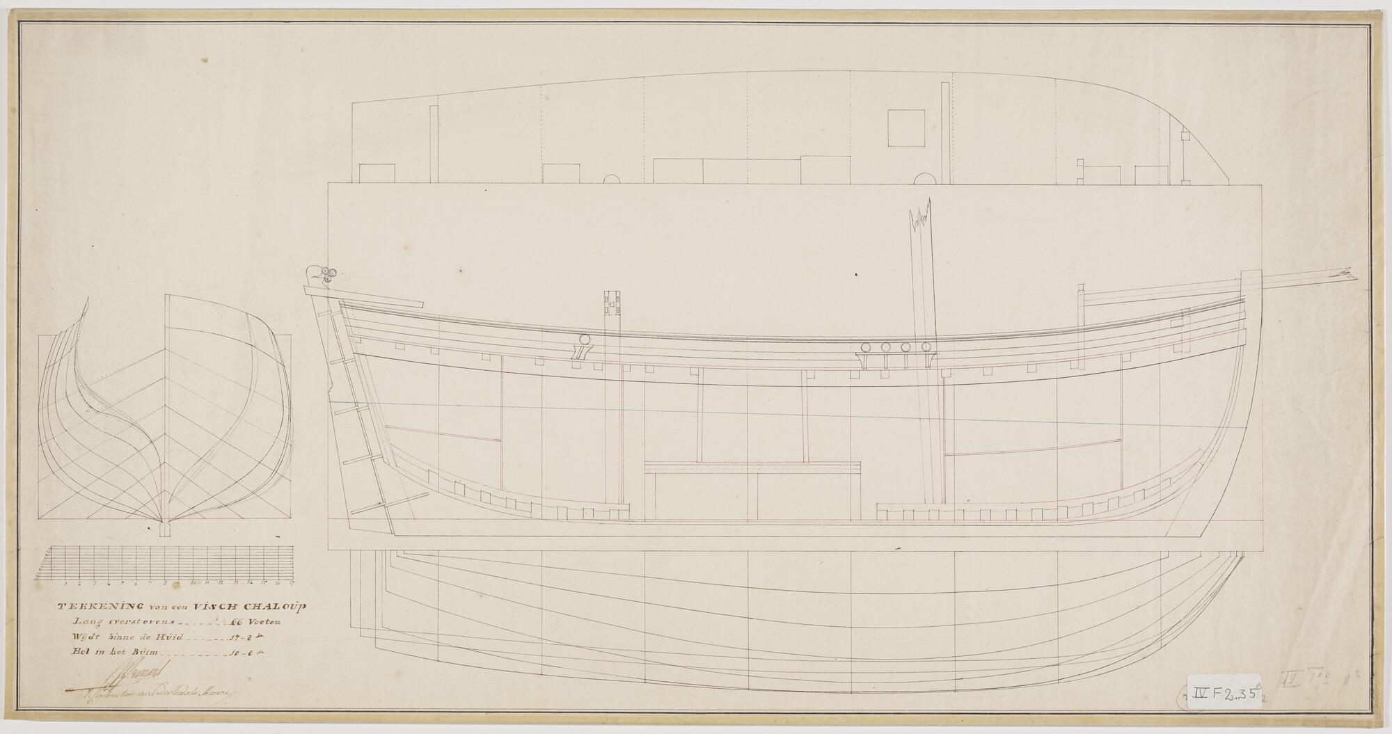 Zijaanzicht, verticale langsdoorsnede, boven-, voor- en achteraanzicht en spantenraam van een vissloep