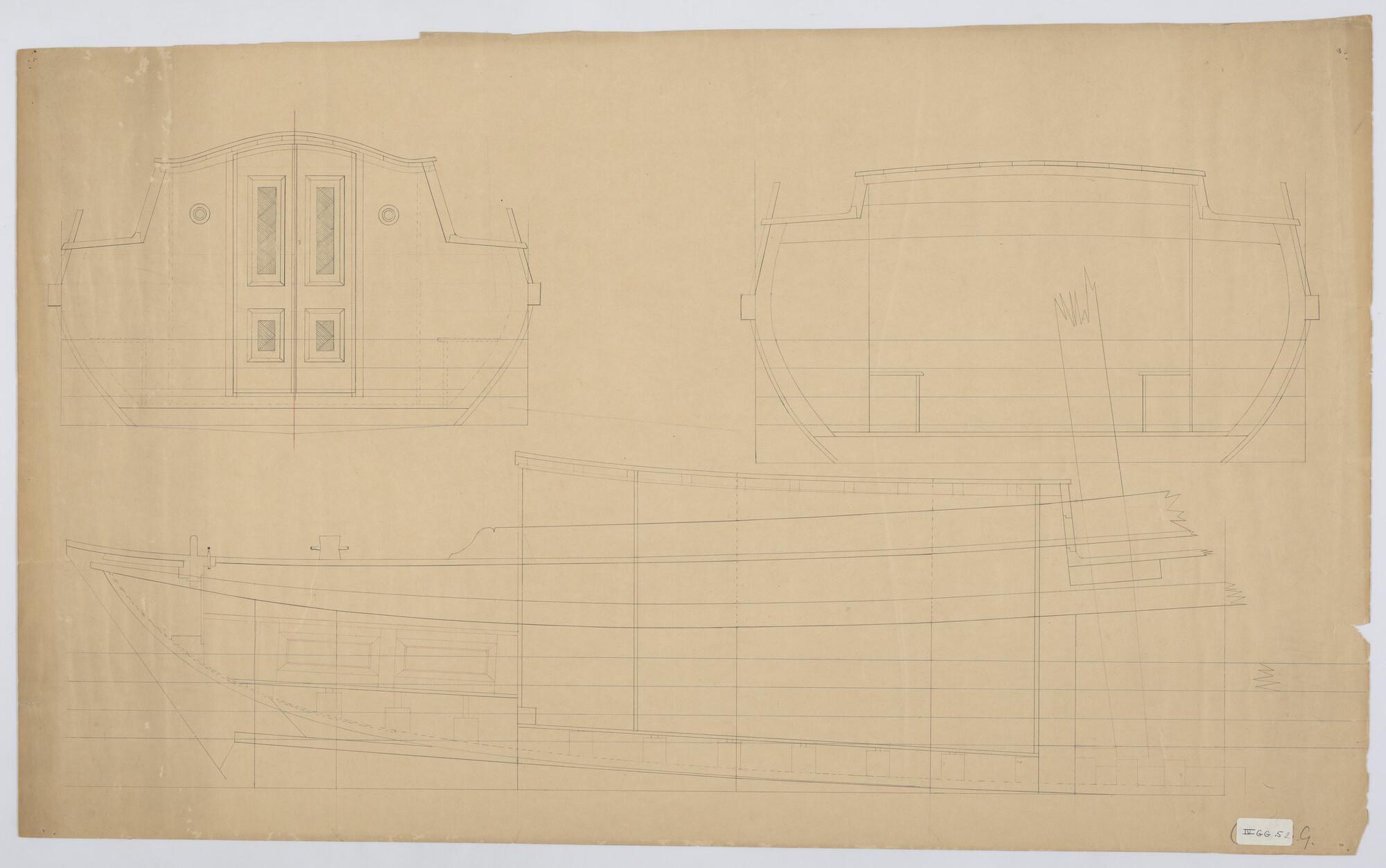 Rijksbotters "Arend" en "Valk", 1889. Achteraanzicht, verticale langsdoorsnede, en zijaanzicht, bovenaanzicht en achteraanzicht van de roef van de rijksbotters "Arend" en "Valk" 1889.