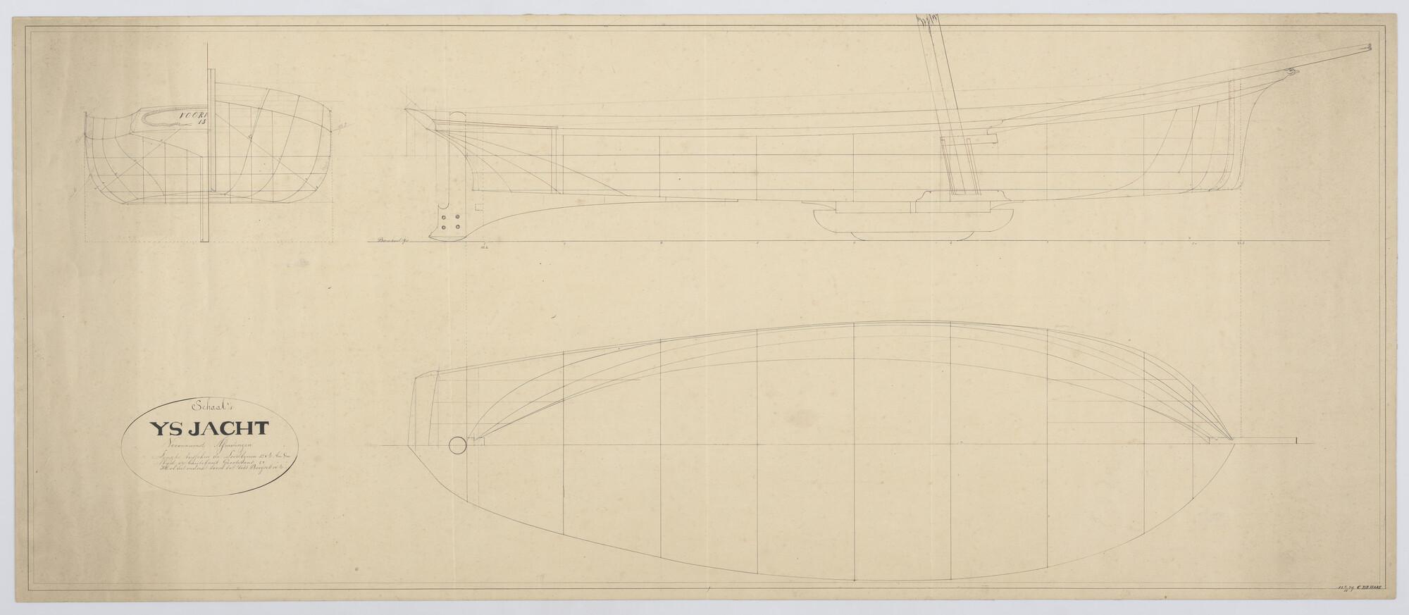 Zijaanzicht, met tuig, van het ijsjacht Voorwaarts.