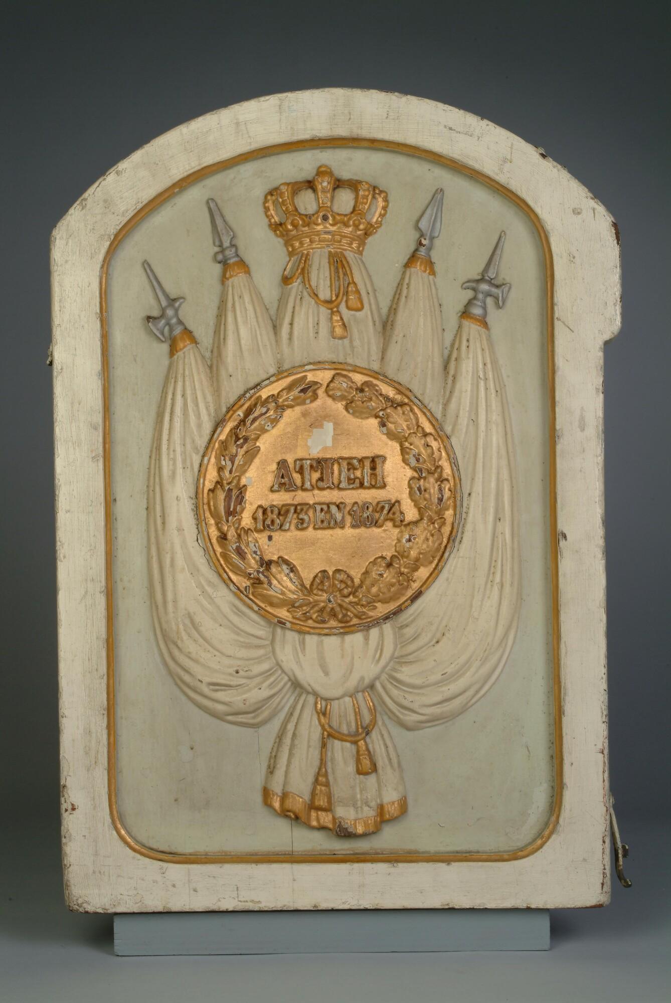 Langwerpig bord met halfronde bovenkant met in het midden een medaillon met waarop opschrift 'Atjeh 1873 en 1874', omgeven door een laurierkrans. De voorstelling is omgeven door een vergulde binnenrand. De ondergrond is grijs geschilderd.