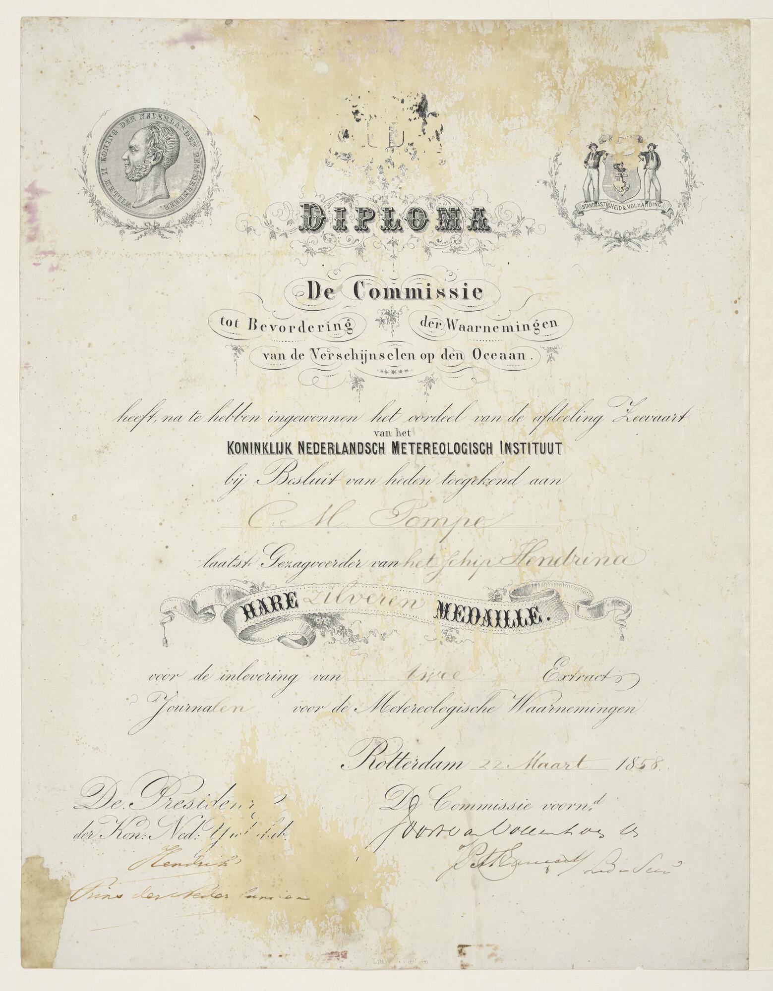 Diploma van de Commissie tot Bevordering der Waarnemingen van de Verschijnselen op den Oceaan voor C.M. Pompe, gezagvoerder van de Hendrina, gedateerd 22 maart 1858. Behorend bij een zilveren medaille.