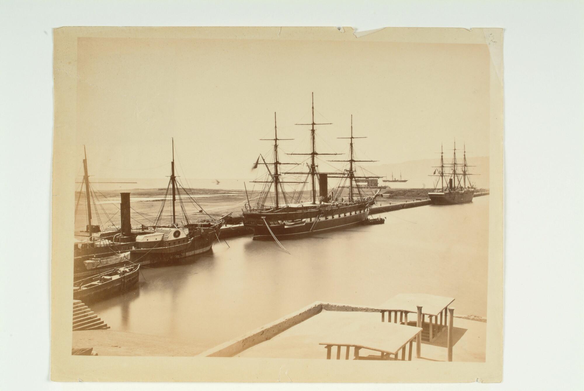 Foto van afgemeerde schepen in de haven van Suez.