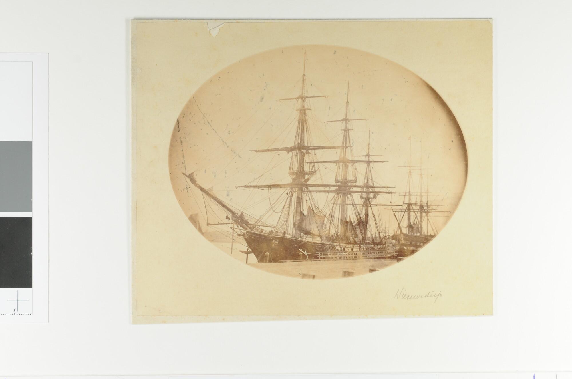 Het fregat met stoomvermogen Zr.Ms. Van Galen afgemeerd aan de kade van het Nieuwe Diep