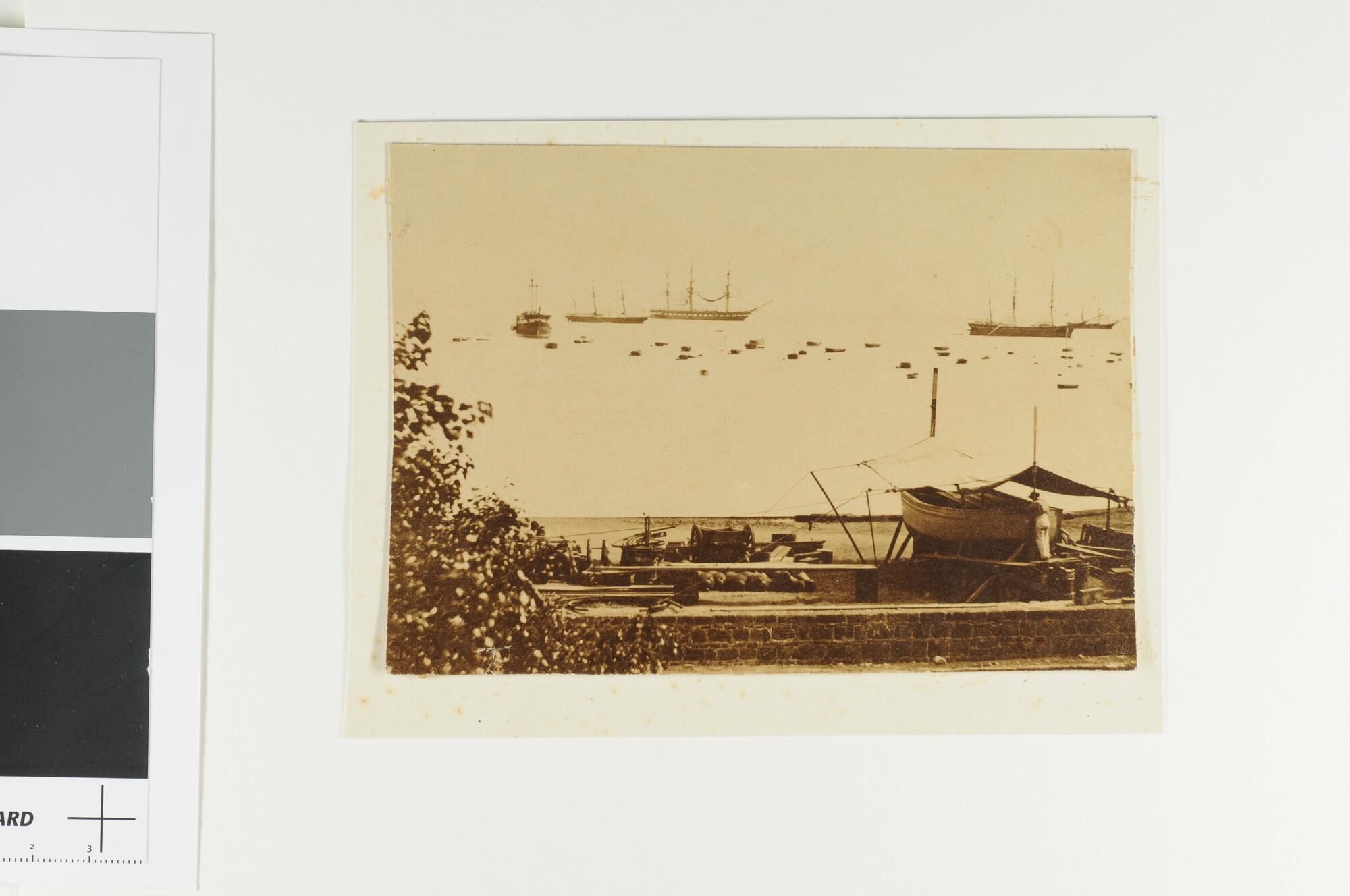 Gezicht op een Indische rede. Vermoedelijk is deze foto genomen op de rede van het eiland Onrust. Op de rede liggen meerdere Nederlandse marineschepen, zoals een fregat en een schoener. Op de voorgrond ligt een sloep onder een zonnetent in onderhoud.