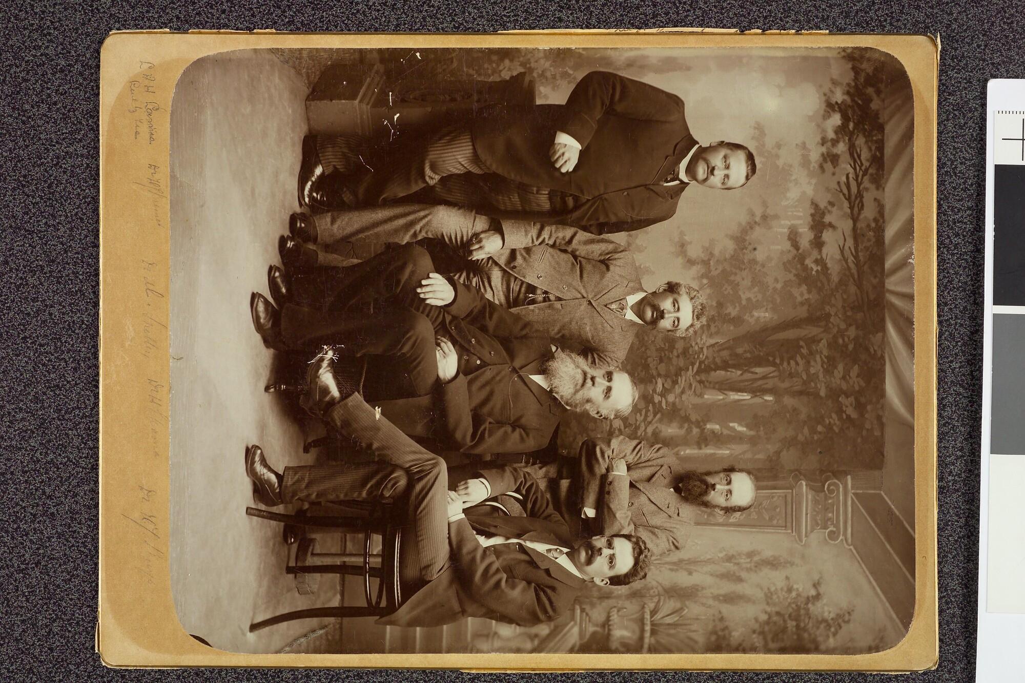 Groepsportret van de wetenschappelijke staf van de Noordpool expeditie 1882-1883, met van links naar rechts luitenant ter zee L.A.H. Lamie, Dr. H.J. Kremer, Dr. M. Snellen, Dr. H. Ekama en Dr. H.J. Ruys.
