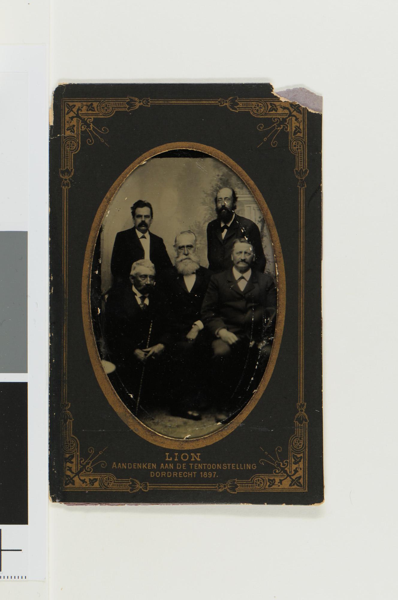 Groepsportret van de wetenschappelijke staf van de Noordpool expeditie 1882 - 1883, met van links naar rechts Dr. H.J. Ruys (staand), Dr. H.J. Kremer (zittend), Dr. M. Snellen (midden), Dr. H. Ekama (staand) en luitenant ter zee L.A.H. Lamie (zittend).