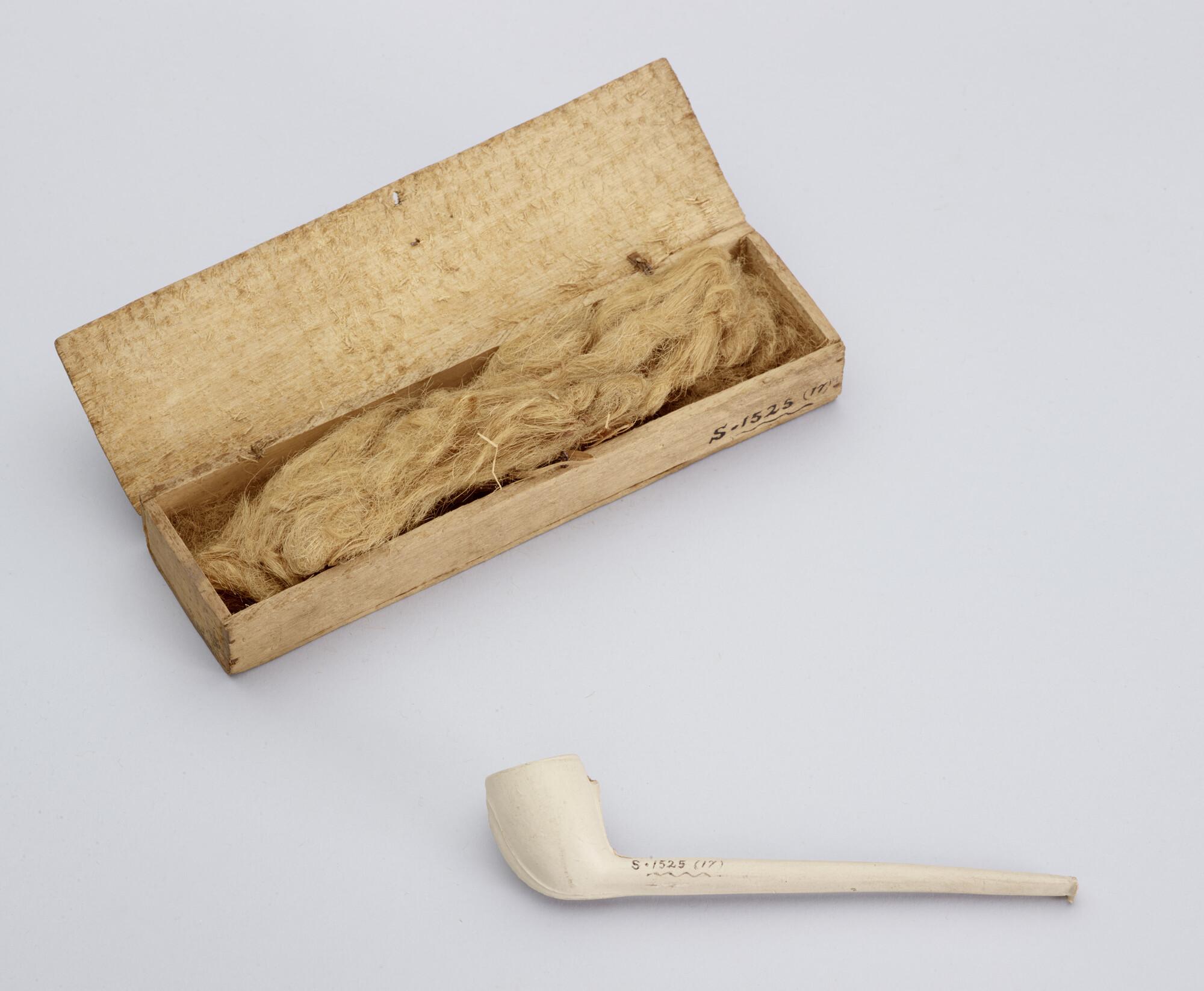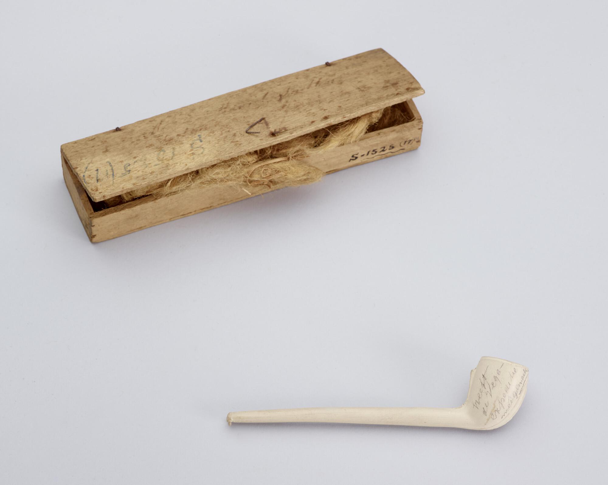 Rookpijp, aardewerk, in houten doosje. In het doosje breeuwsel ter bescherming van het pijpje. Op het pijpje de tekst: 'Heeft Vega expeditie meegemaakt'. Het pijpje is in bezit geweest van Henri Ekama, die de Nederlandse Poolexpeditie van 1882-83 meemaakte.