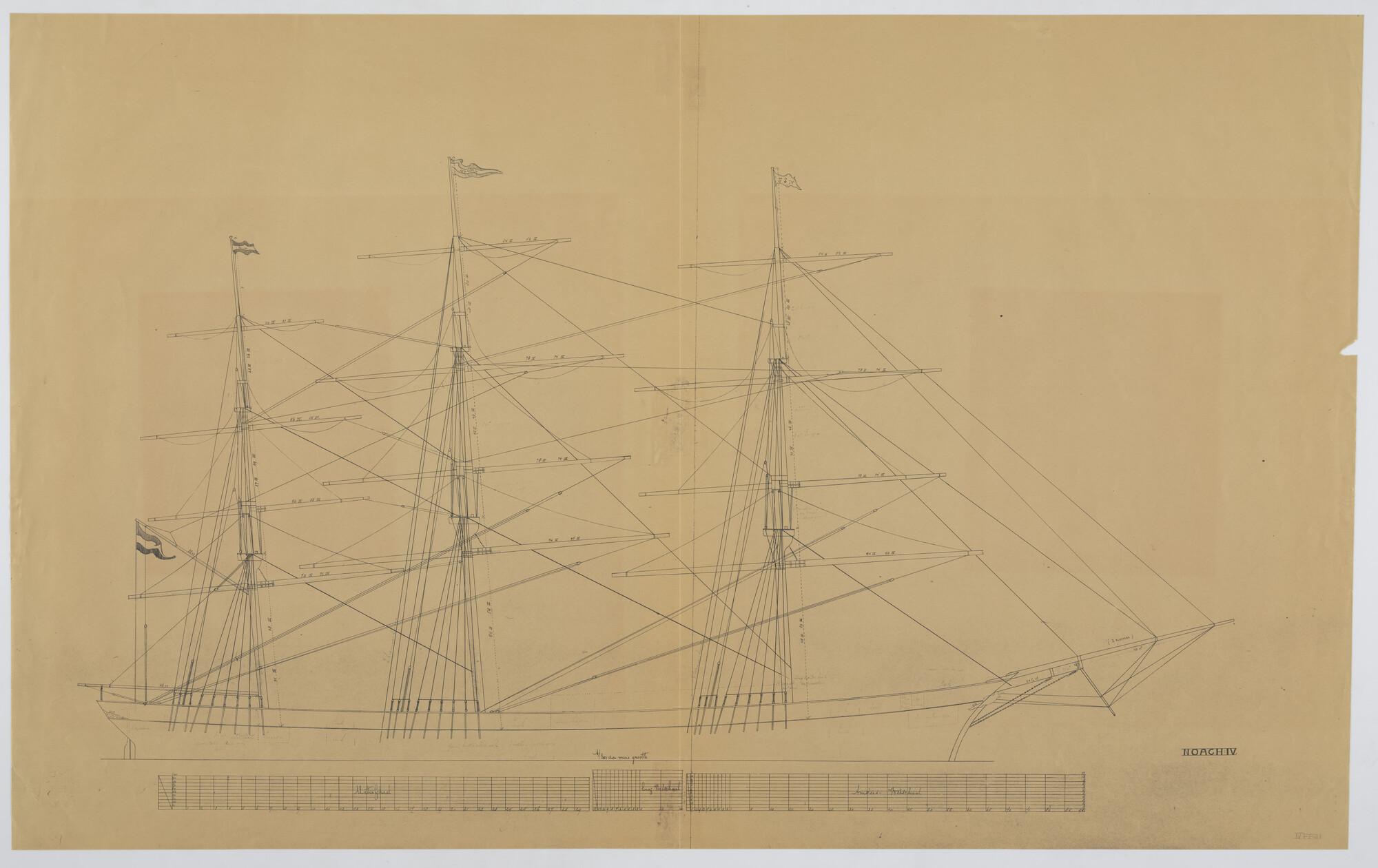 Klipperfregat "Noach IV", 1873 Gebouwd: A. Smit Slikkerveer. Tuigplan. Compositiebouw.