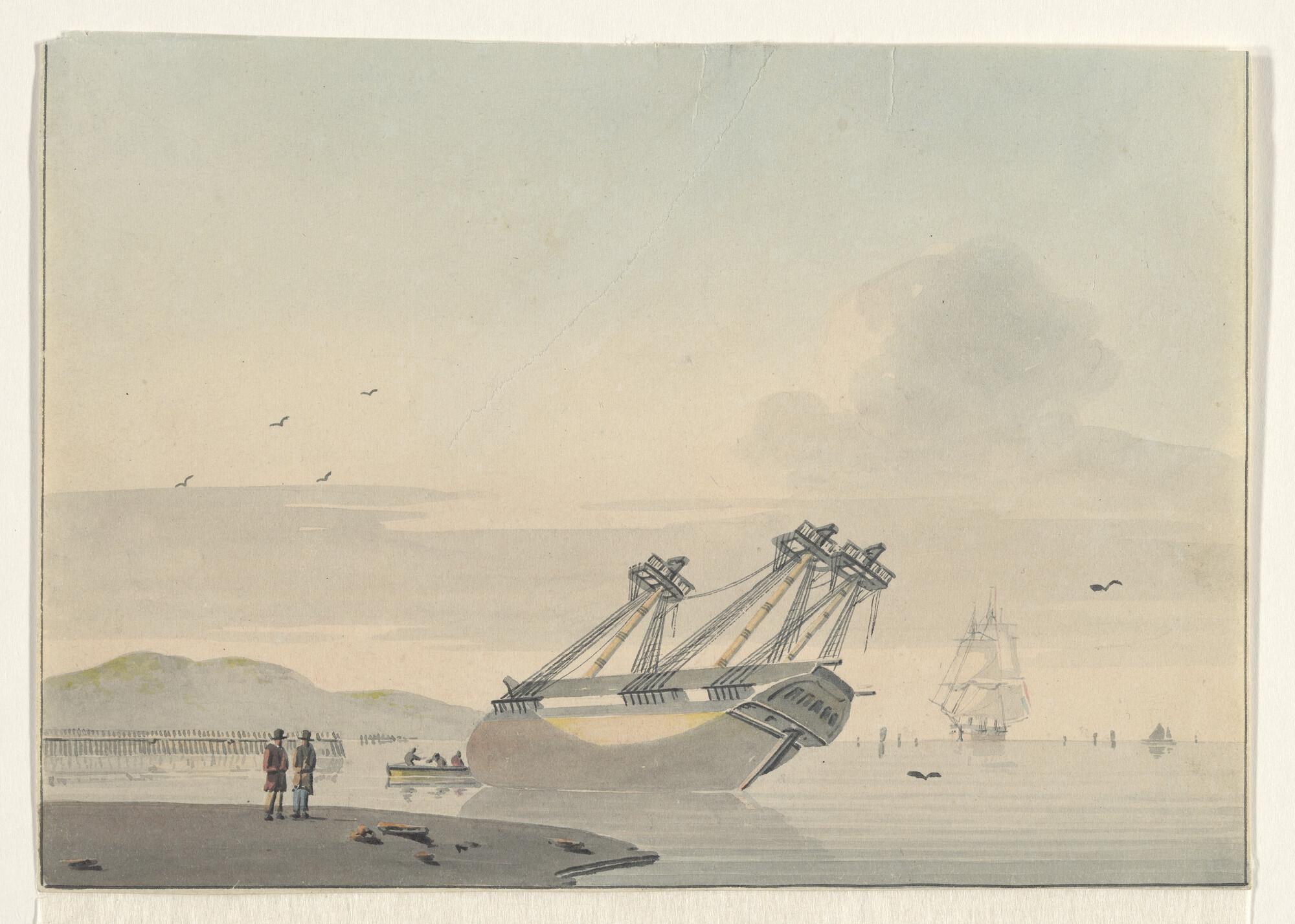 Een fregatschip op een droogvalling