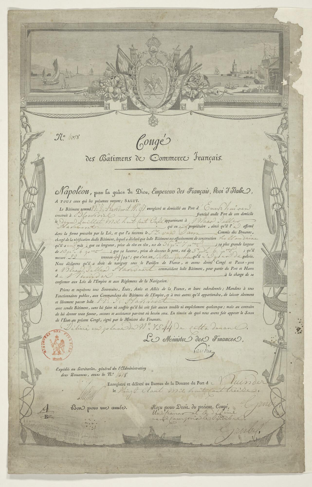 Vergunning om onder Franse vlag te varen, 1812.