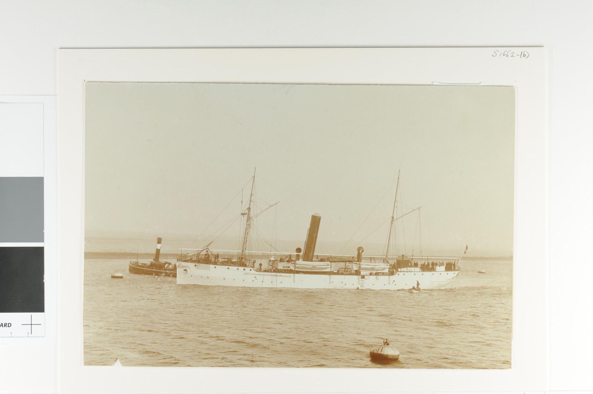 Het flottieljevaartuig Hr.Ms. "Nias" bij het vertrek naar Nederlands-Indië, bakboordaanzicht.