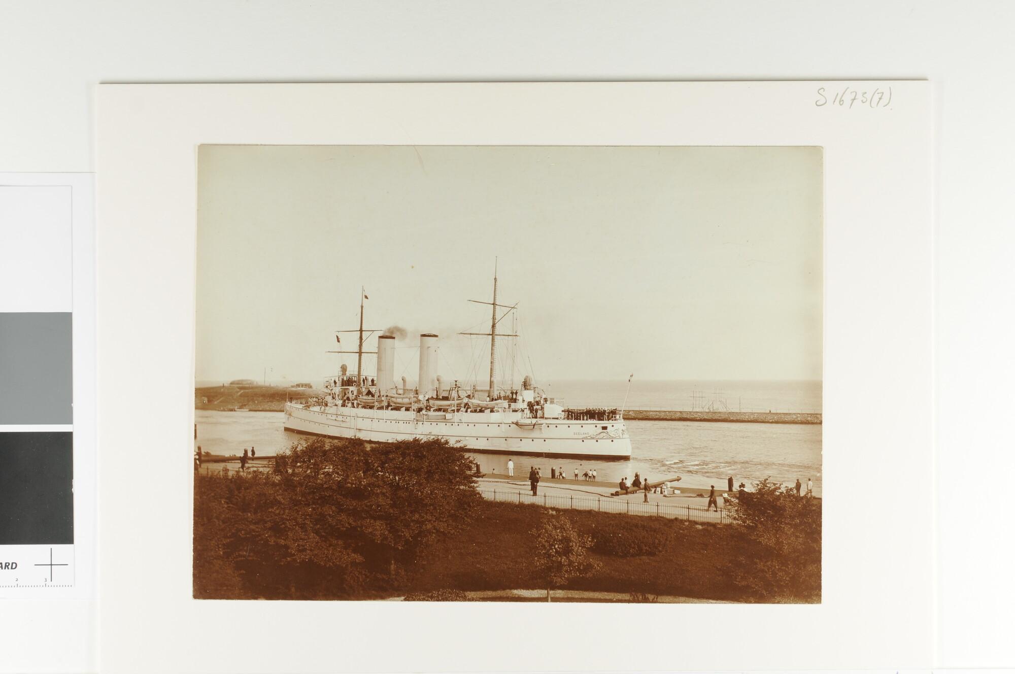 Het pantserdekschip Hr.Ms. "Zeeland" bij het vertrek uit het Nieuwe Diep (Den Helder). Links op de achtergrond is het pantserfort Harssens te zien.
