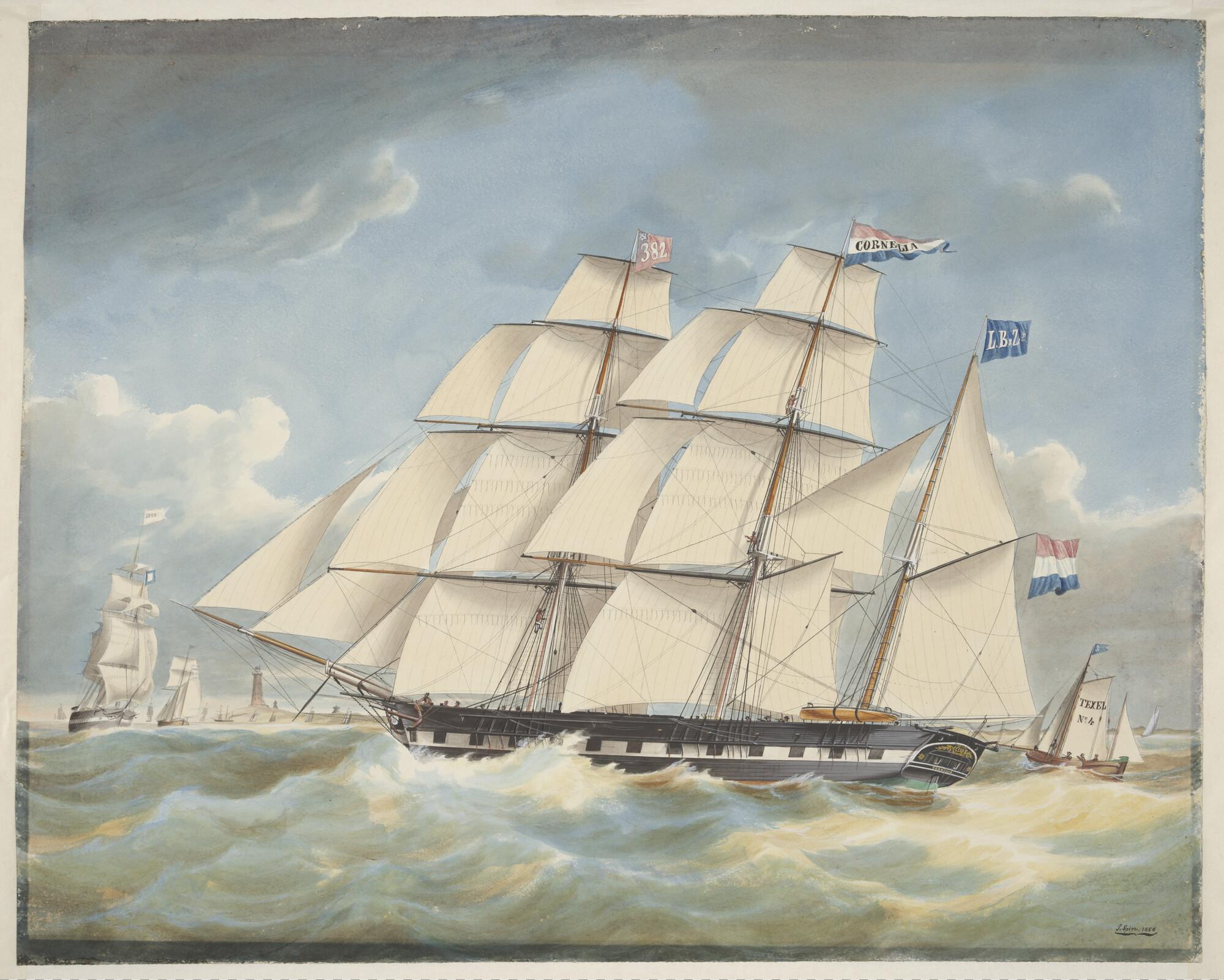 Het barkschip Cornelia en de loodsboot Texel No 4 op de rede van Texel
