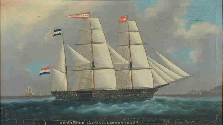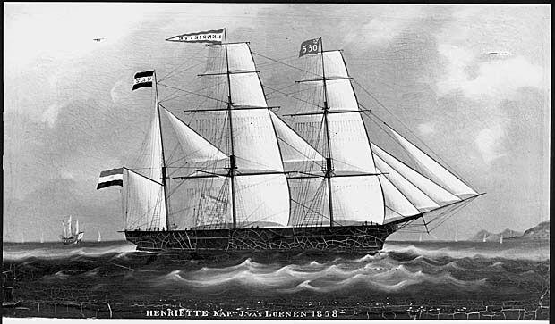 Het barkschip Henriette zeilend op een Oost-Aziatische rede.