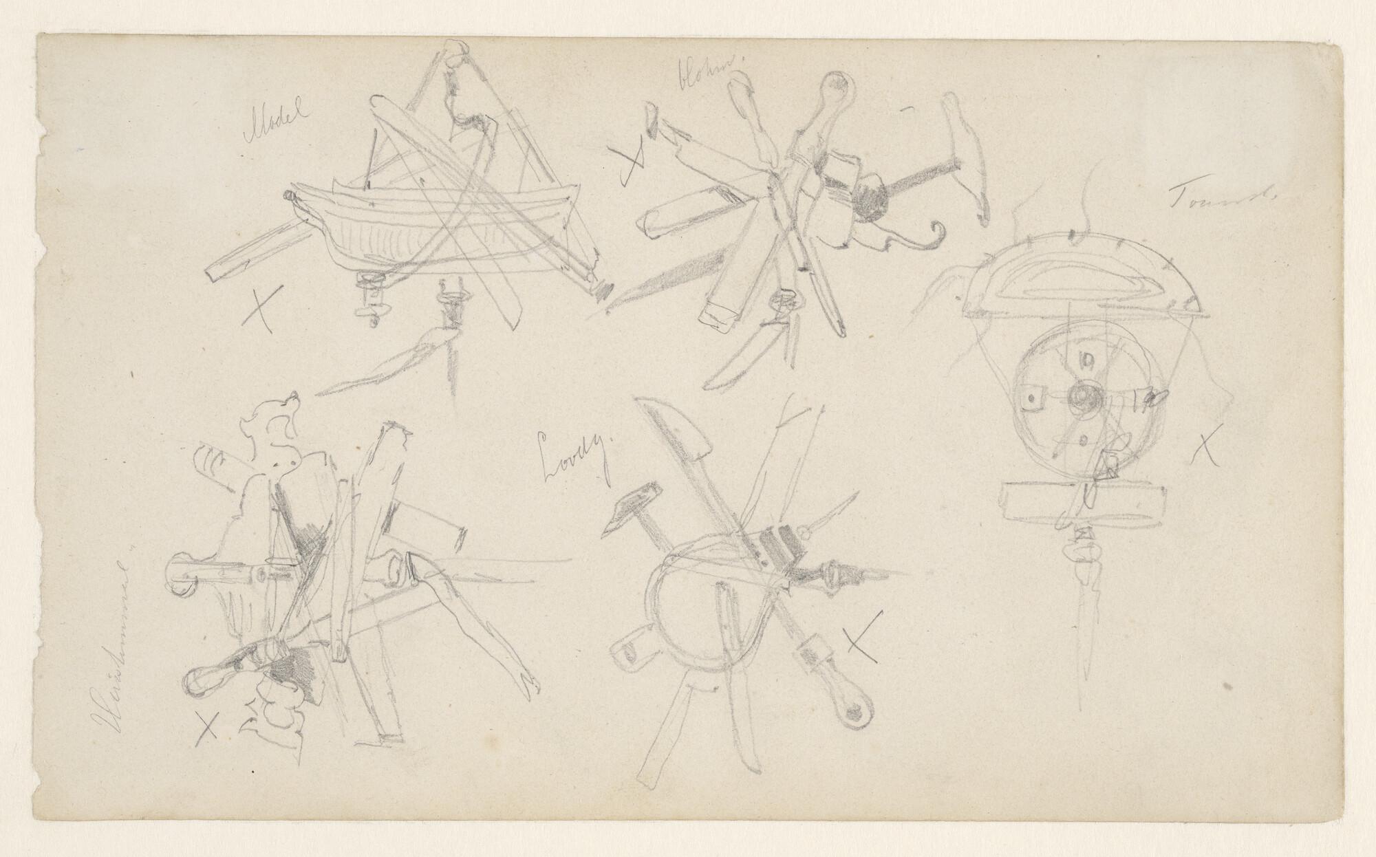 Schetsen van attributen die het personeel van de Rijkswerf met zich meedroeg in de optocht ter herdenking van het herstel van de Nederlandse onafhankelijkheid, november 1863.