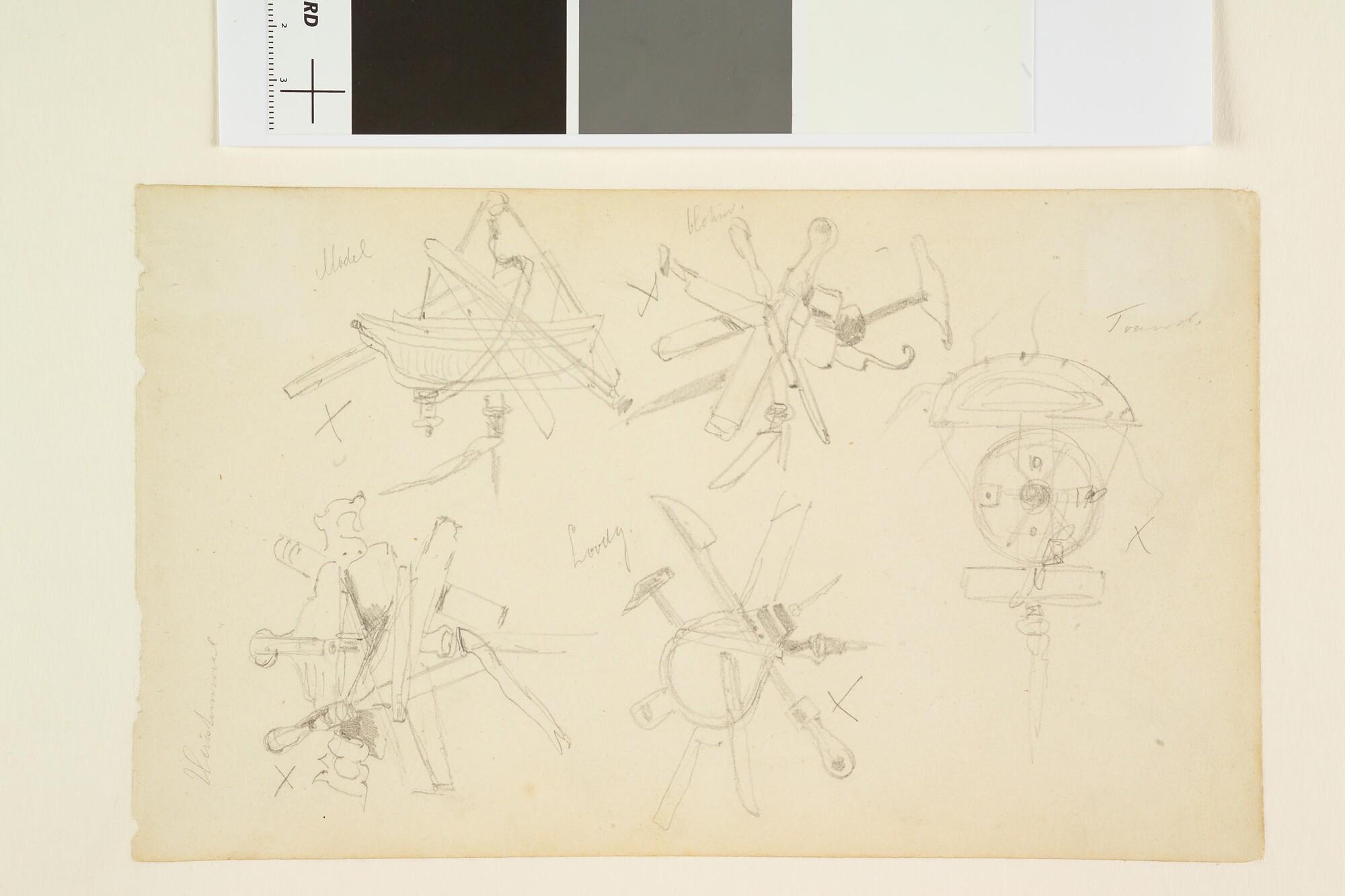 Schetsen van attributen die het personeel van de Rijkswerf met zich meedroeg