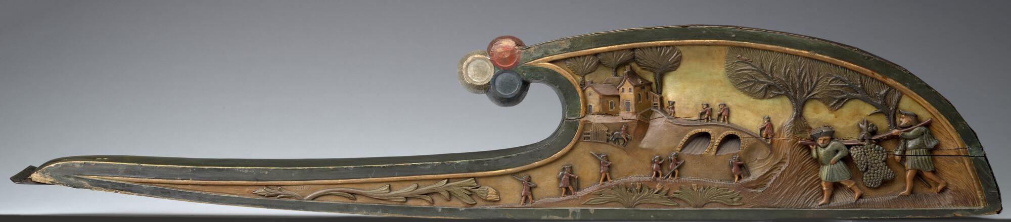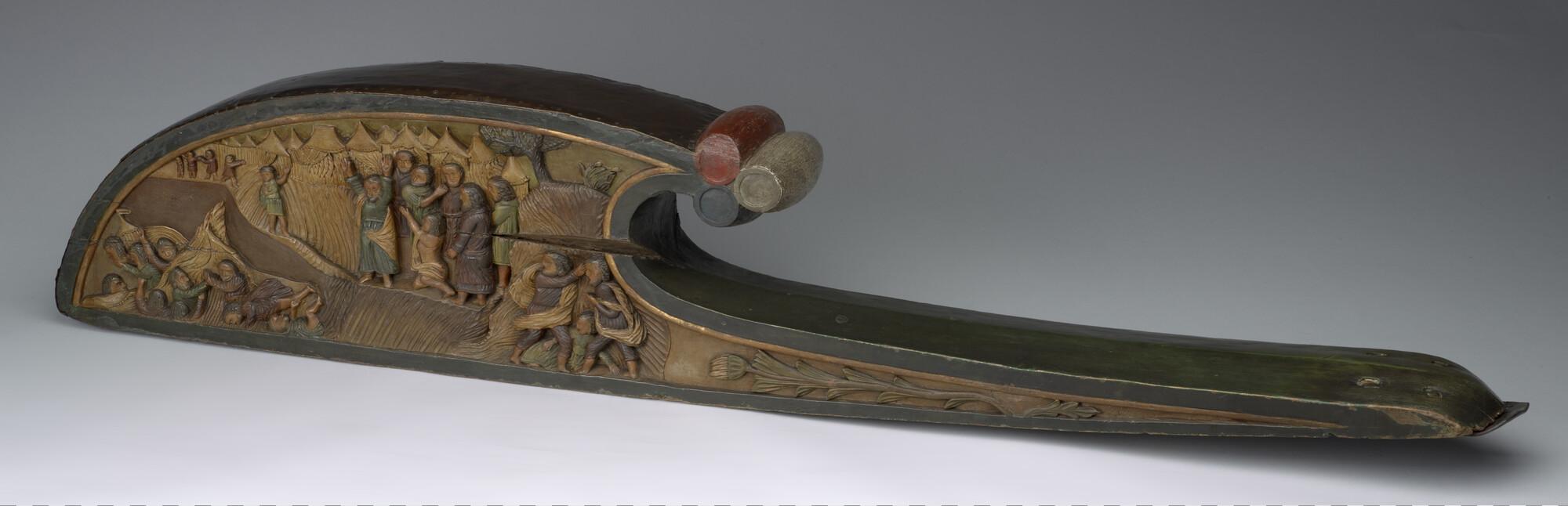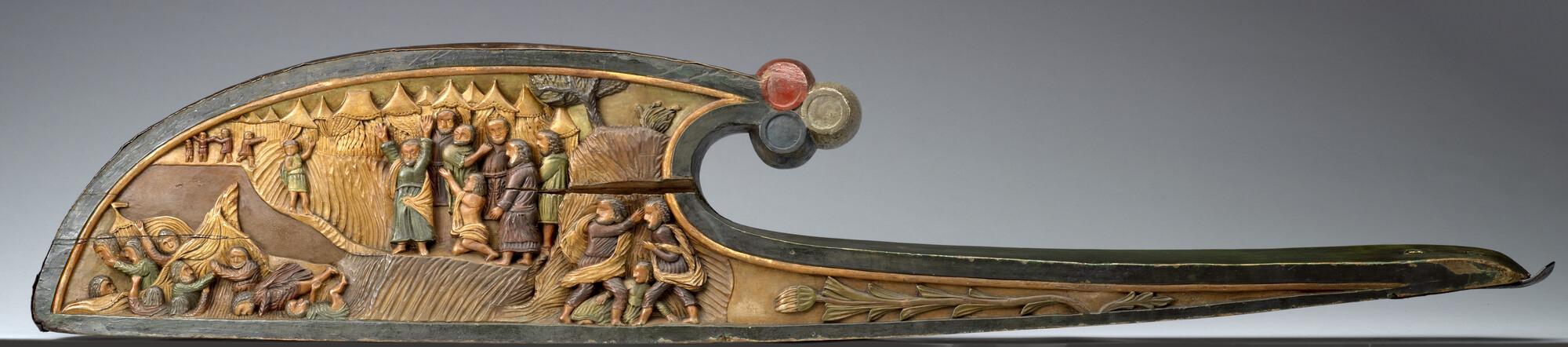 Roerklik afkomstig van een 's Gravenmoerse aak met Bijbelse voorstellingen. Aan stuurboordzijde de tocht van de Joden door de Rode Zee. Aan bakboordzijde de terugkeer van de verspieders uit het land Kanaan.