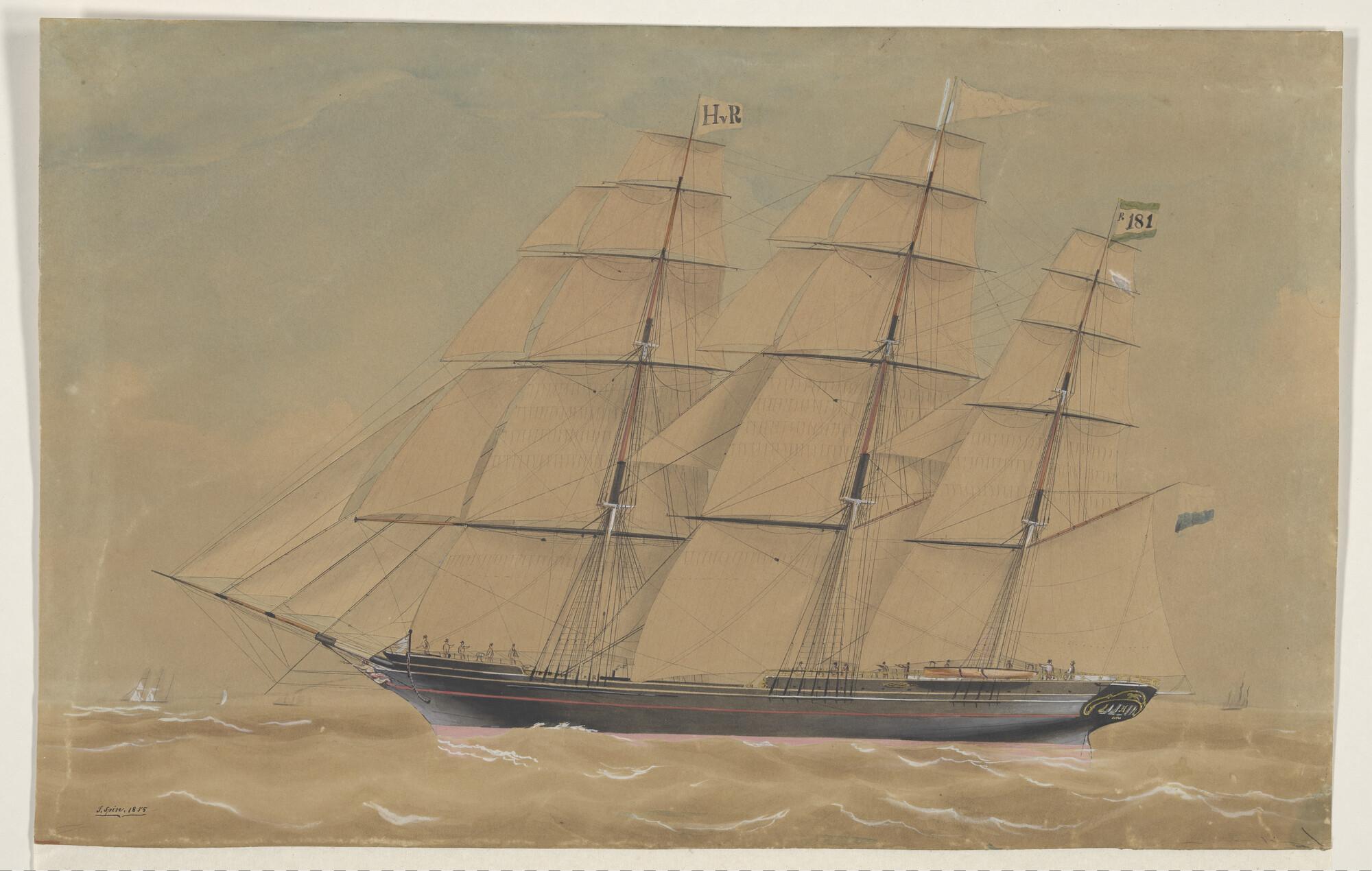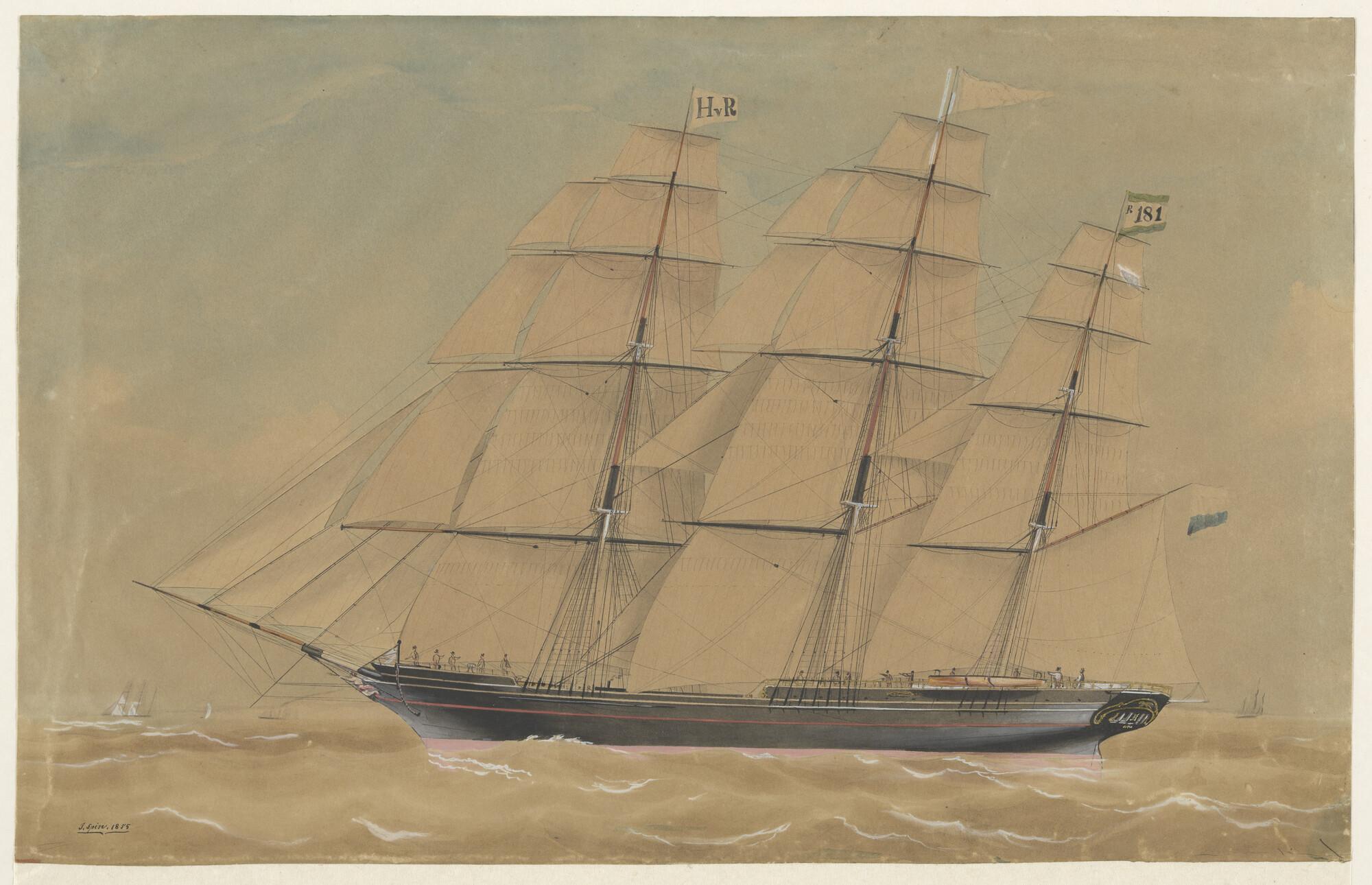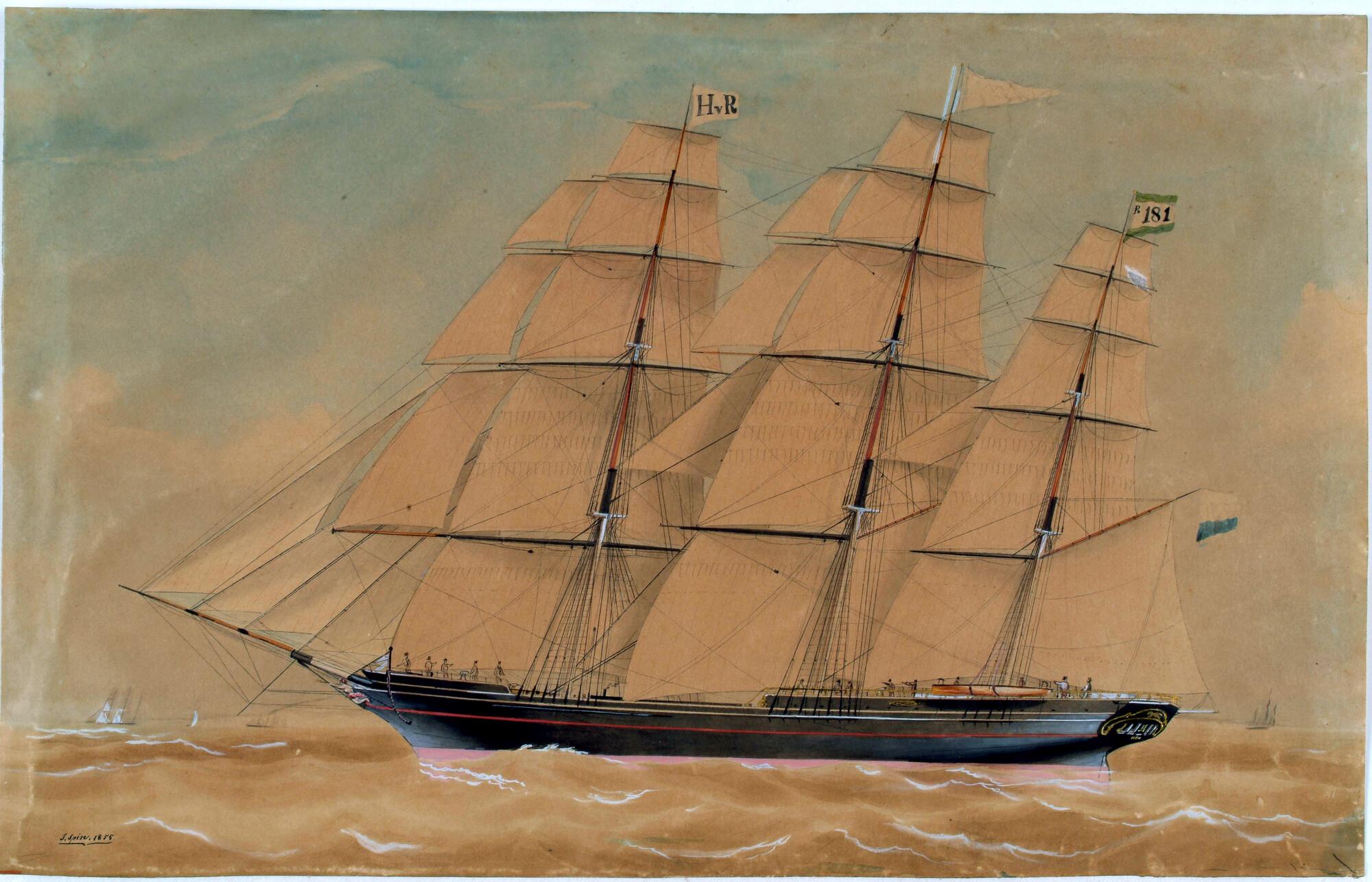 Het klipperfregatschip "Ternate" onder zeil, onder commando van kapitein F. Cars. Het schip voert de rederijvlag van H. van Rijckevorsel te Rotterdam en de vlag nummer R181 van de Maatschappij tot Nut der Zeevaart te Rotterdam.