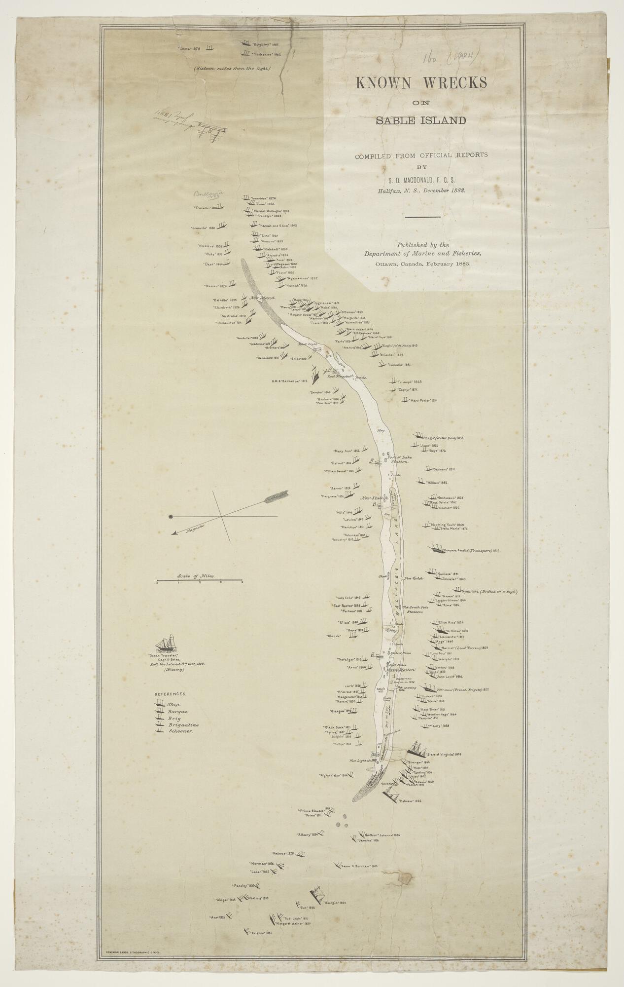 Kaart waarop aangegeven de circa 150 wrakken bij Sable Island, samengesteld in 1882 door S.D. Macdonald. Uitgave Department of marine & fisheries, Ottawa, 1883.