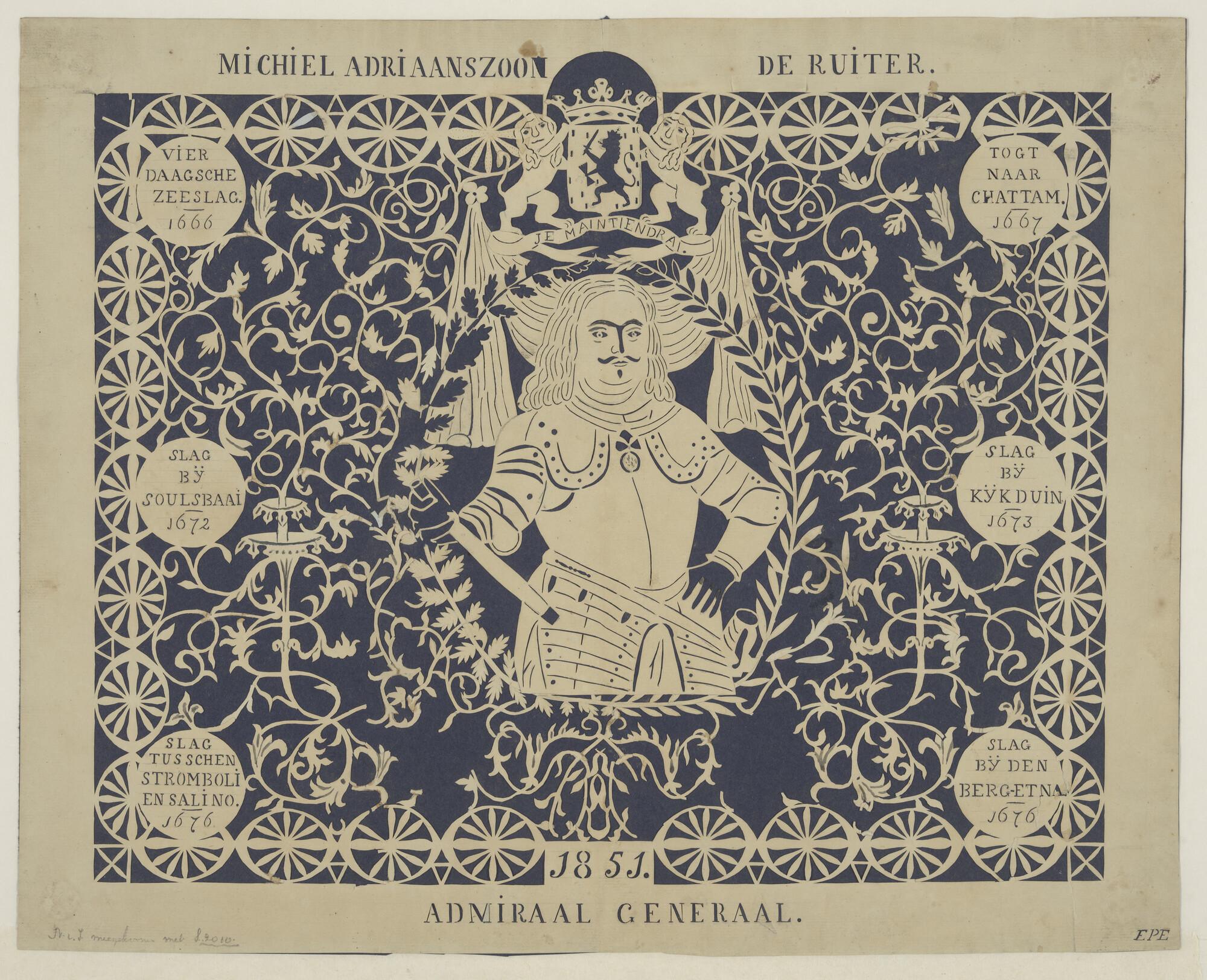 Papierknipwerk met portret van Michiel de Ruyter, omgeven door zes medaillons, met de namen van zeeslagen tussen 1666 en 1676, waaraan De Ruyter deelnam.