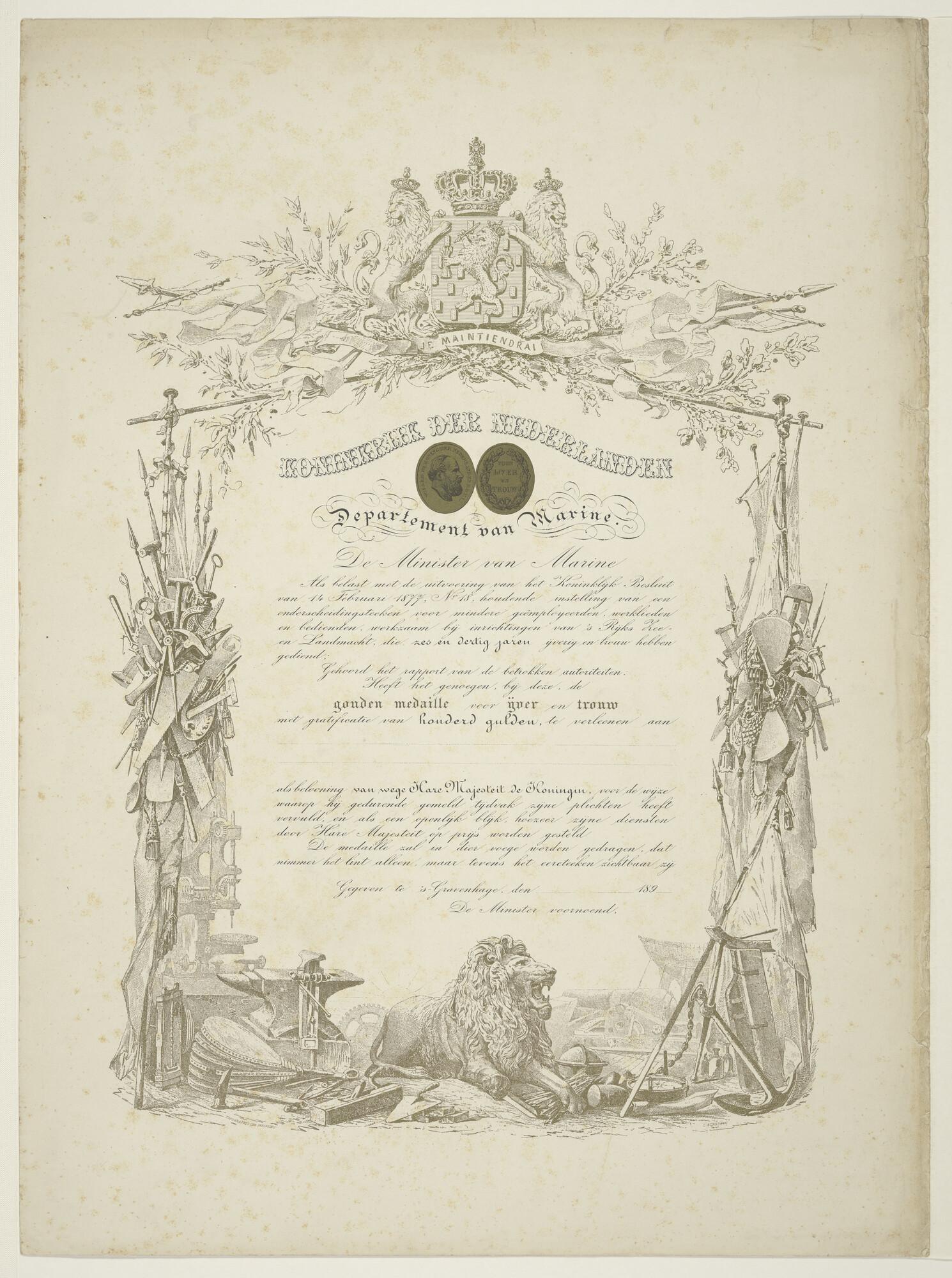 Diploma, behorend bij gouden medaille voor ijver en trouw