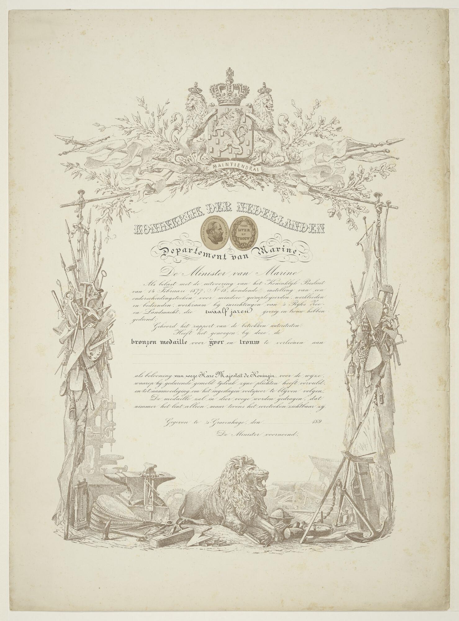 Diploma, behorend bij bronzen medaille voor ijver en trouw