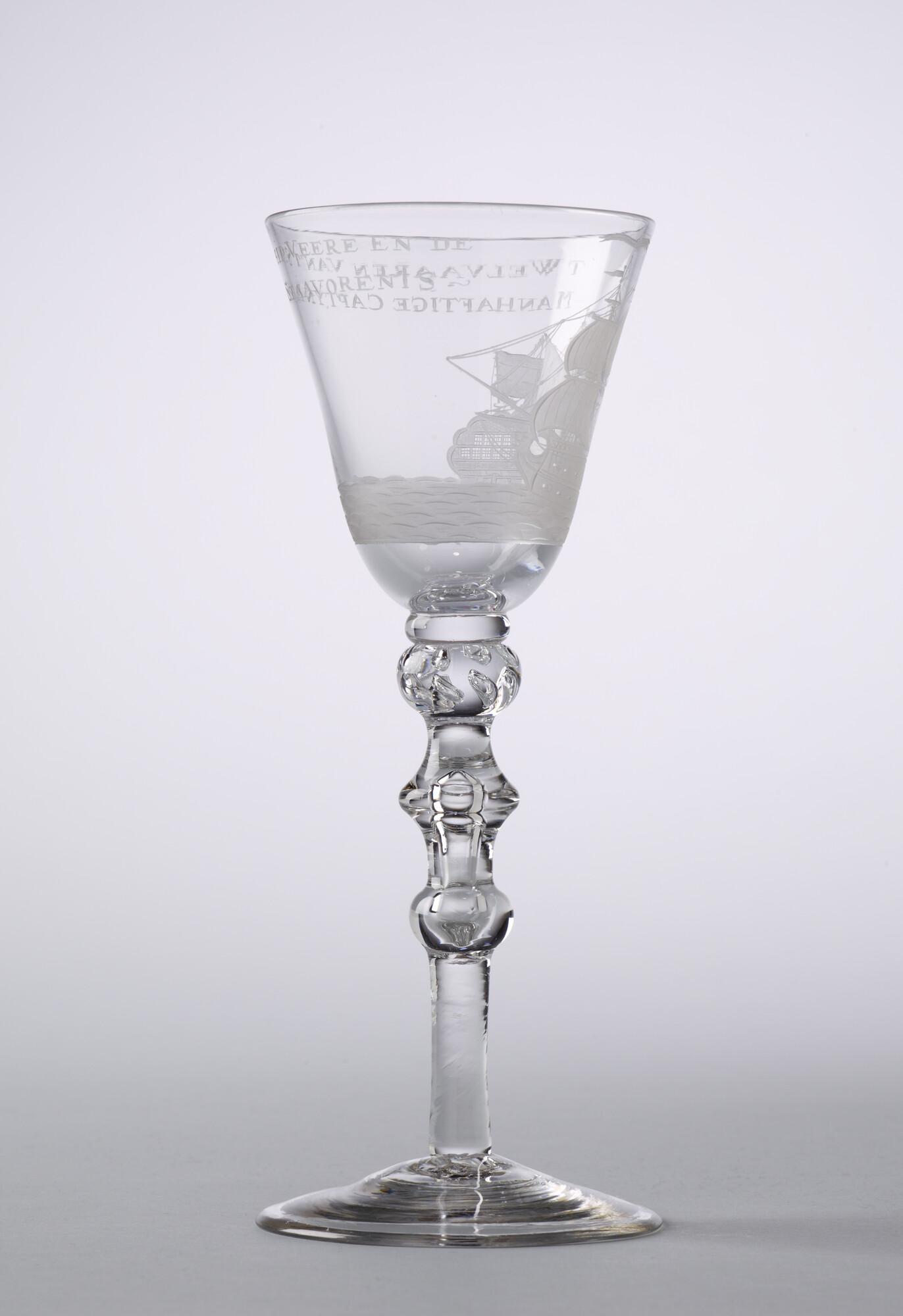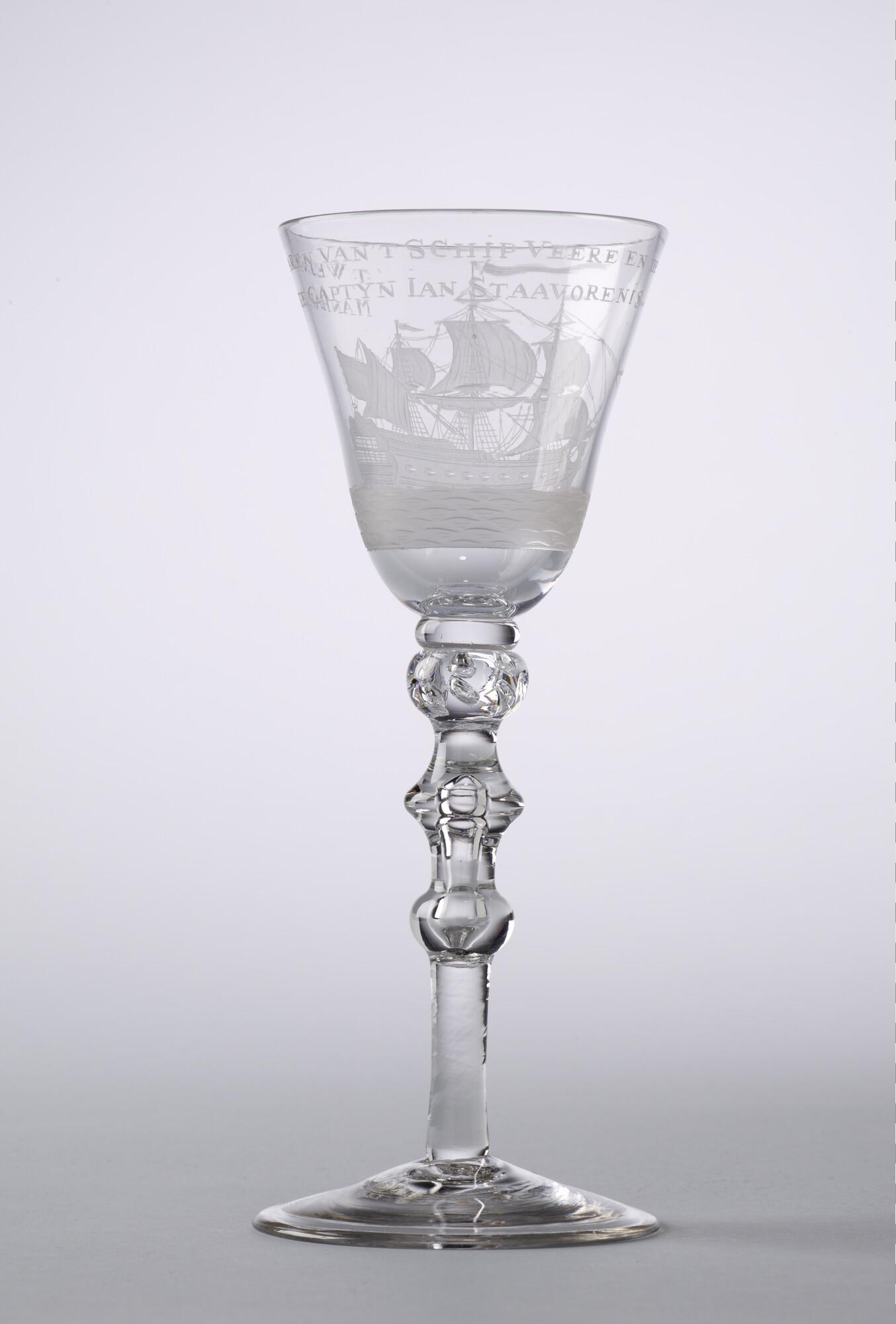 Kelkglas met radgravure van een driemaster en het opschrift "T Welvaaren van 't schip Veere en de manhaftige captyn Ian Staavorenis".
