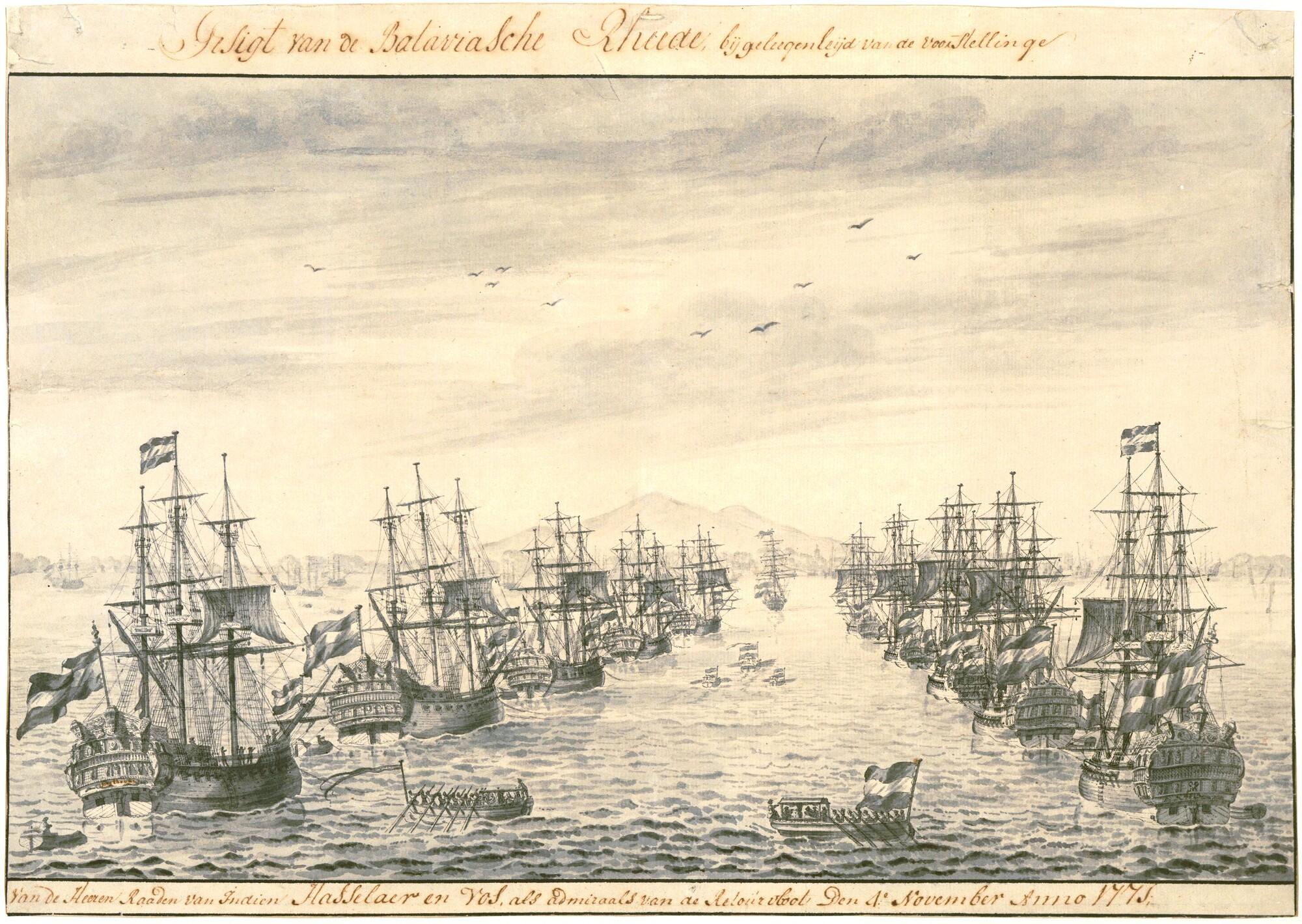 Retourvloot van elf schepen, onder bevel van de Raden van Indië Hasselaer en Vos, liggend op de rede van Batavia, 4 november 1771.