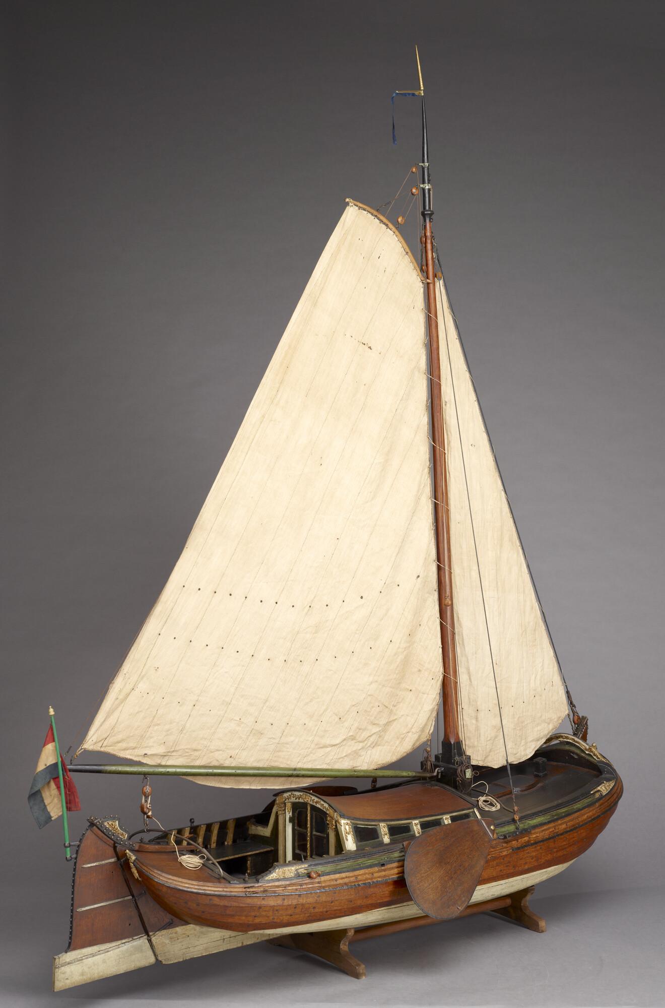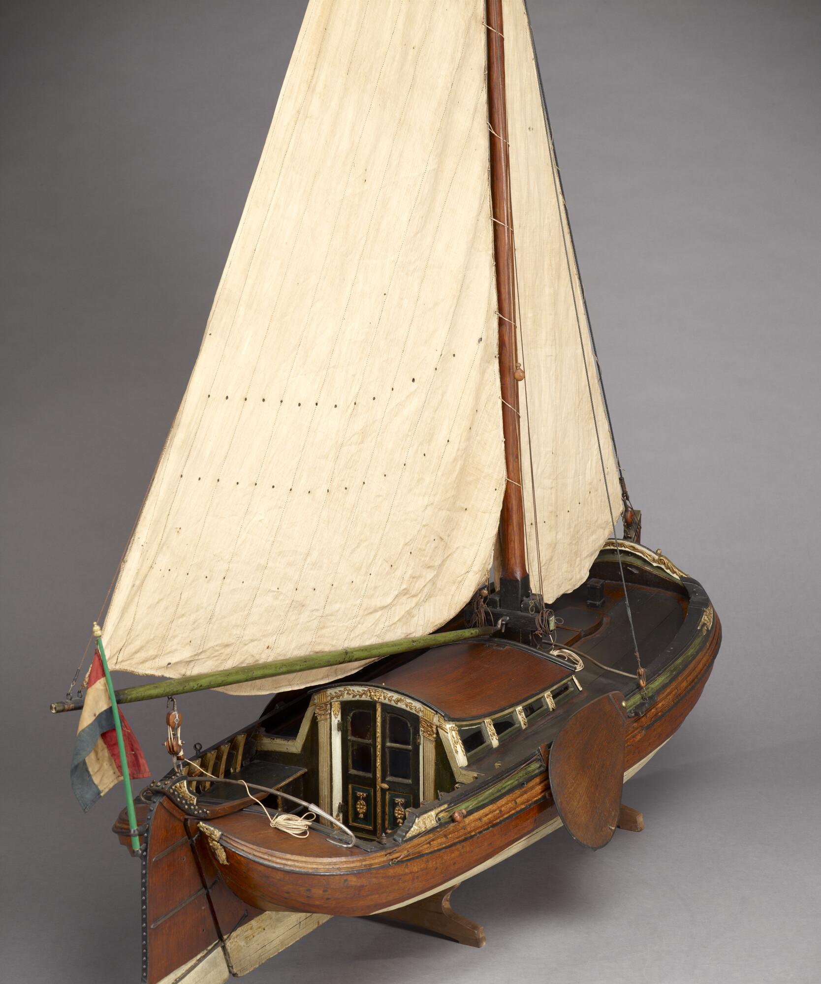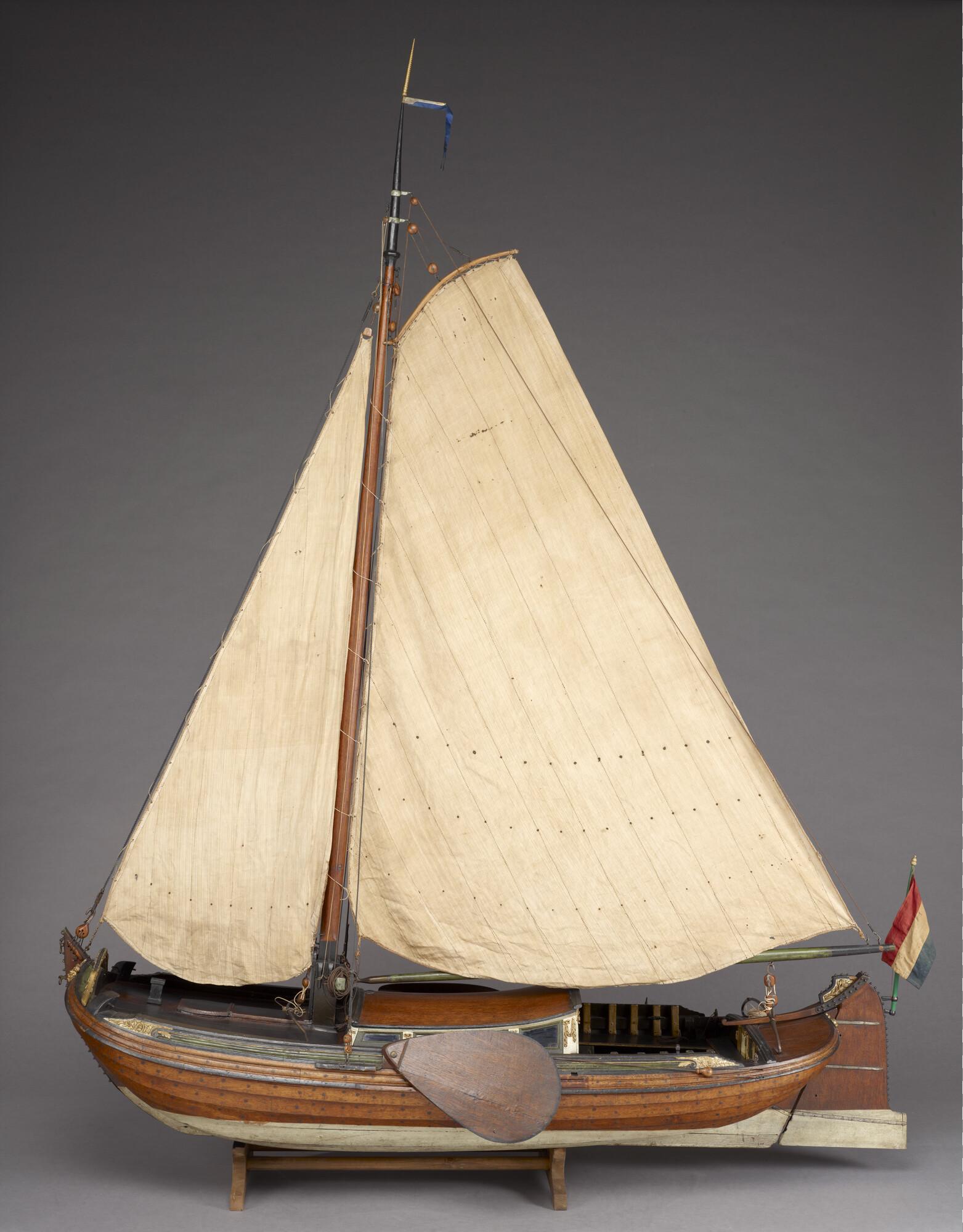 Getuigd model van een overnaads gebouwde Zaanse boeier. De boegen gaan door de 90 graden heen. Het model is niet gepiekt, en heeft een berghout. Aansluitend op het vlak heeft deze boeier vijf gangen. Op het mastschild een schelp en een bijenkorf. Het dak van de roef is wegneembaar. In de roef is het interieur ...