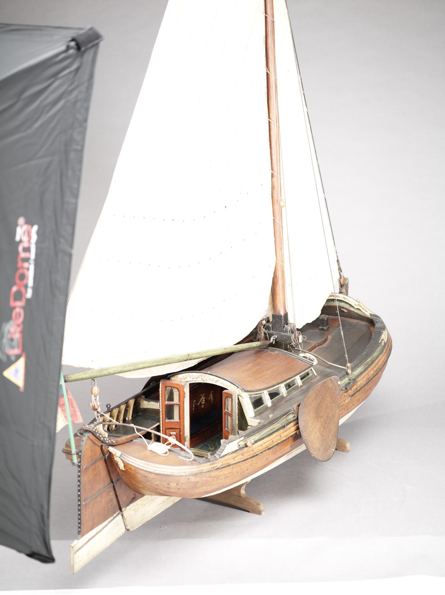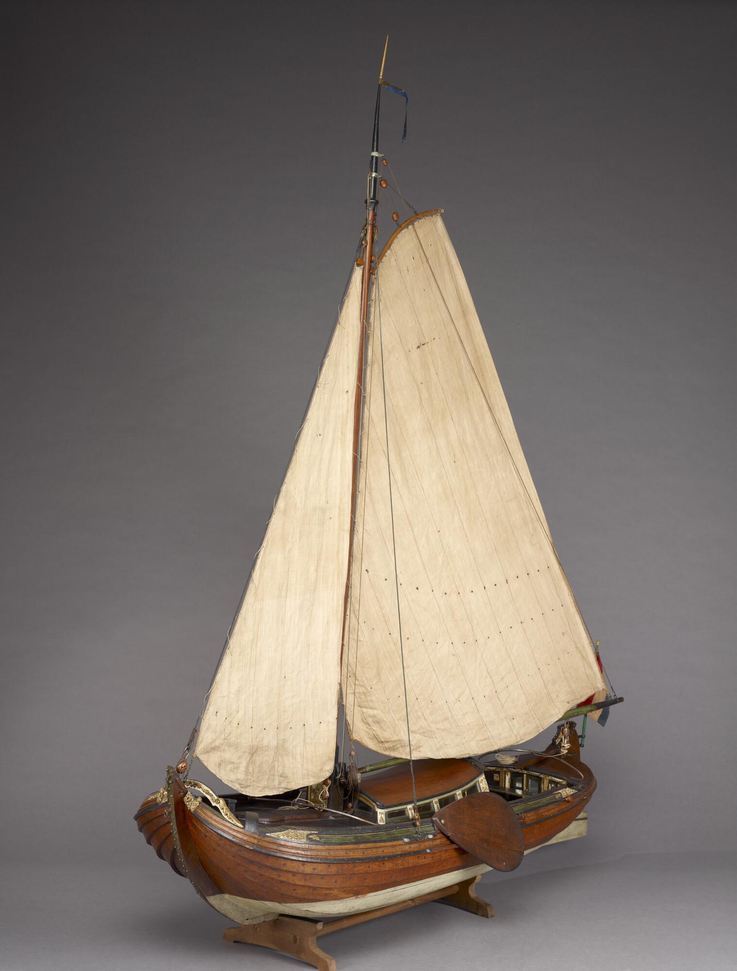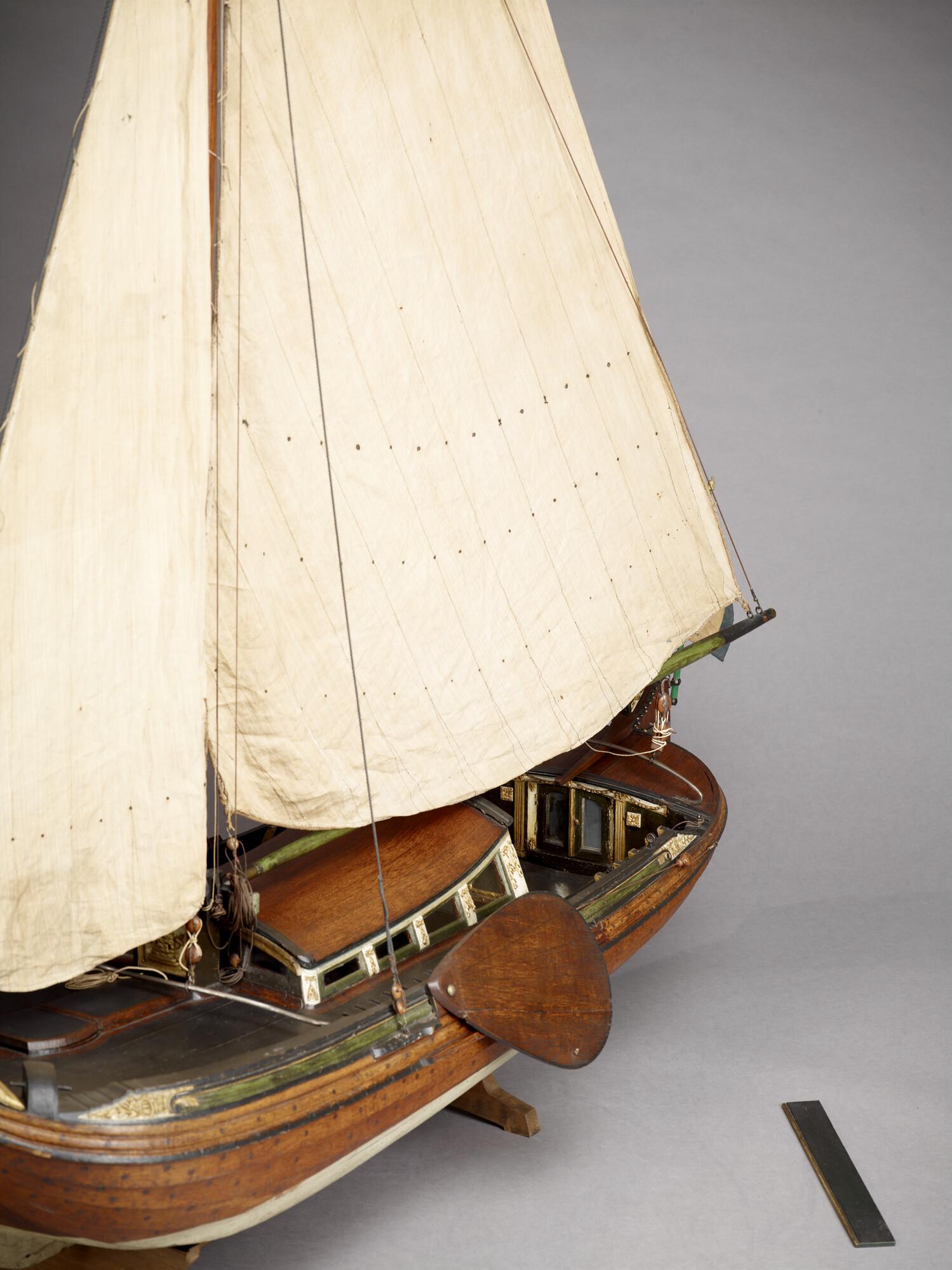 Getuigd model van een overnaads gebouwde Zaanse boeier. De boegen gaan door de 90 graden heen. Het model is niet gepiekt, en heeft een berghout. Aansluitend op het vlak heeft deze boeier vijf gangen. Op het mastschild een schelp en een bijenkorf. Het dak van de roef is wegneembaar. In de roef is het interieur ...
