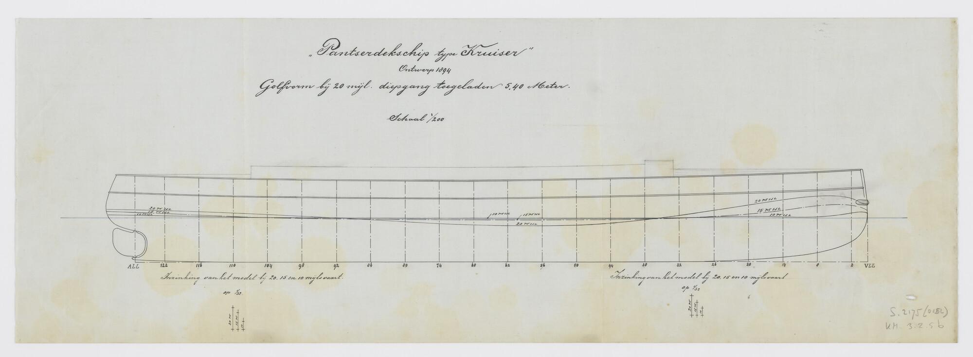 Golfvorm bij 20 mijl van het pantserdekschip Hr.Ms. "Holland" (schaal 1:200).
