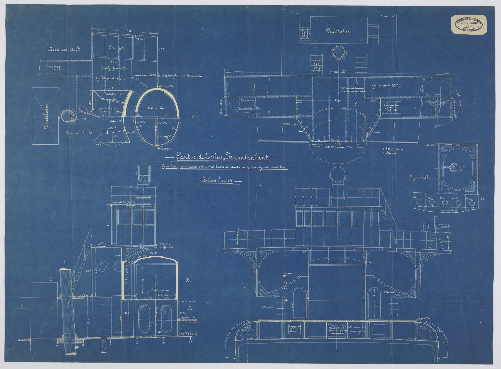 Opstelling commandotoren met kaartenkamer en opperbrug met stuurhuis van het pantserdekschip Hr.Ms. Noord Brabant