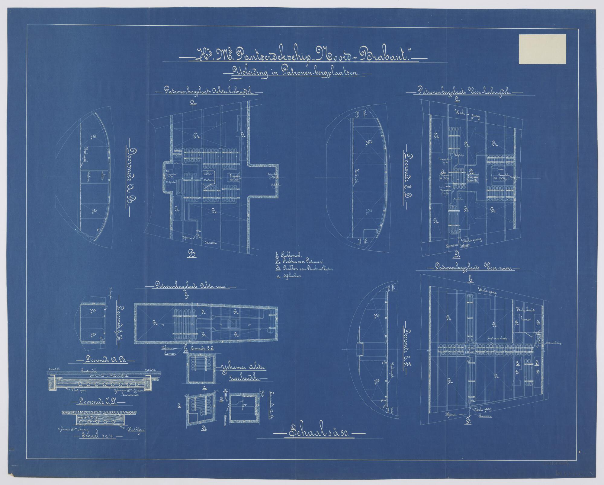 IJsleidng in patronenbergplaatsen van het pantserdekschip Hr.Ms. "Noord Brabant" (schaal 1:50).